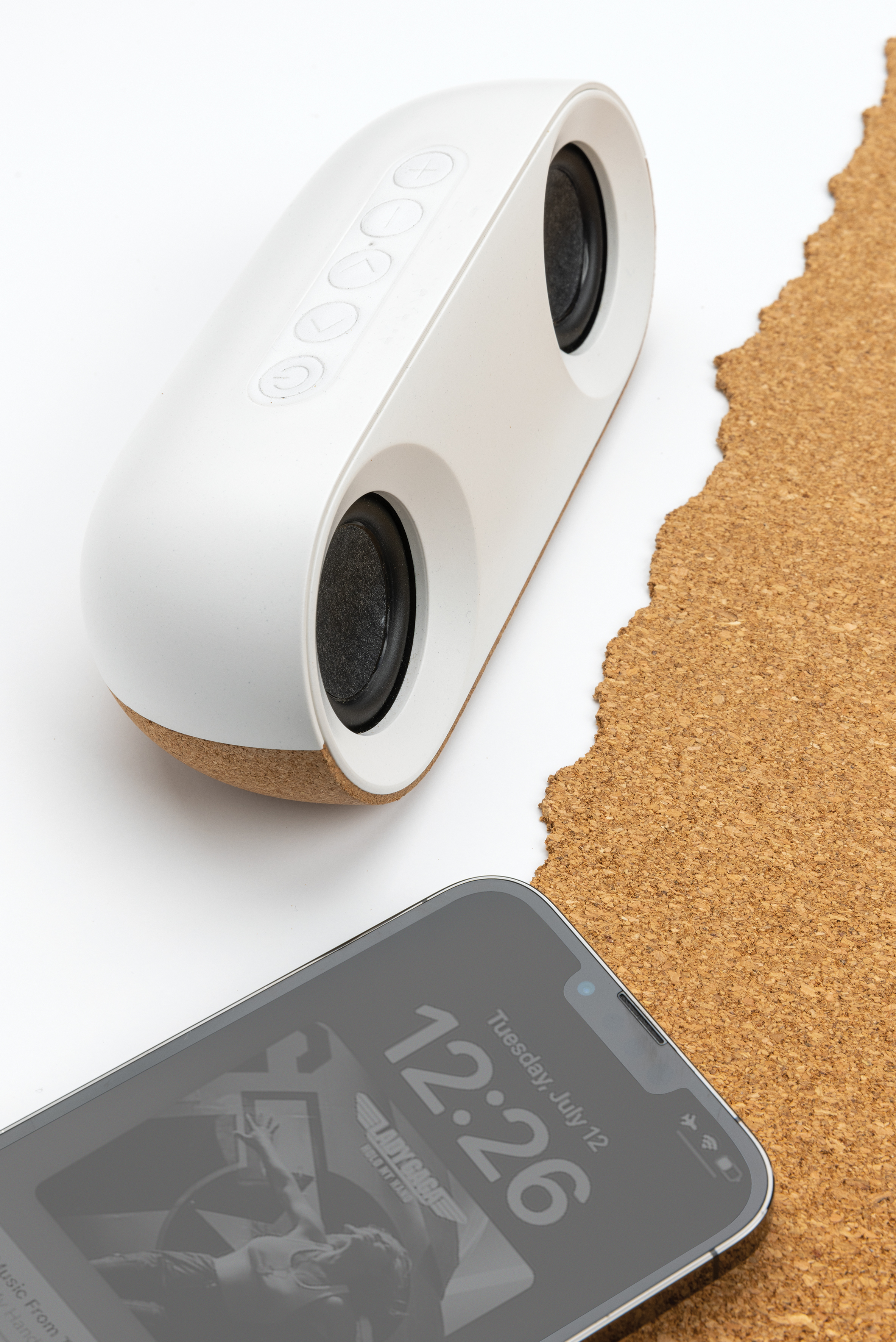 Altavoz inalámbrico de 10W fabricado con FSC® 100% corcho y ABS reciclado certificado RCS (Recycled Claim Standard). Contenido reciclado total: 25% basado en el peso total del artículo. La certificación RCS garantiza una cadena de suministro completamente certificada de los materiales reciclados. El altavoz está equipado con una batería de 1200 mAh para garantizar hasta 10 horas de tiempo de reproducción y BT5.3 para una conexión fluida y un sonido claro. Rango de conexión de hasta 10 metros. Con micrófono y función de descolgar para contestar llamadas. Presentado en caja FSC mix FSC®. Incluye cable de carga de TPE reciclado certificado por RCS. Artículo y accesorios 100% libres de PVC.
