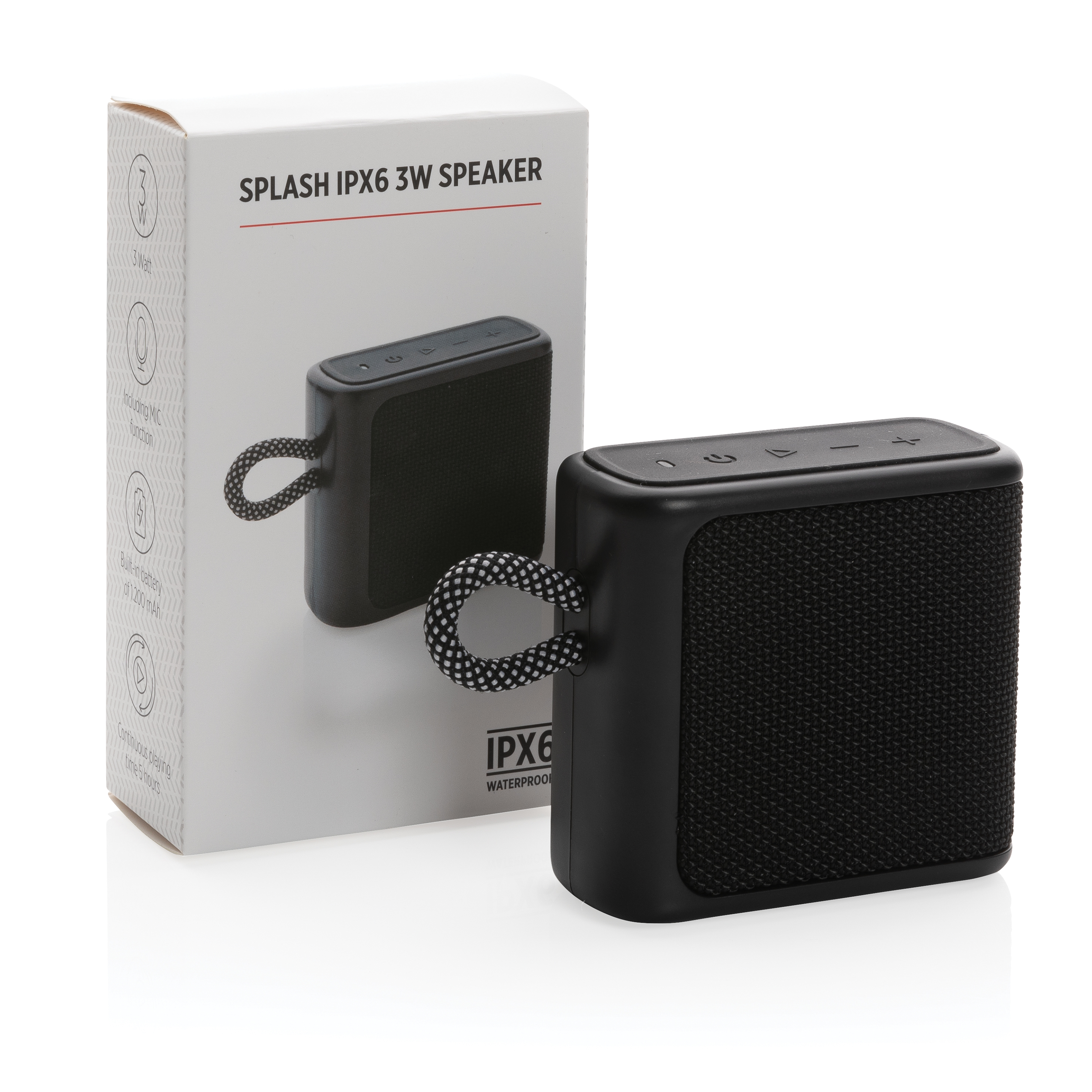 Altavoz impermeable IPX6 de 3W fabricado en ABS y tejido. La batería de 1200 mah permite un tiempo de reproducción de hasta 5 horas. La recarga tarda 3 horas. Distancia de funcionamiento de hasta 10 metros usando BT 5.1. Con micrófono y función de captura para contestar llamadas. Con puerto de entrada tipo C y cable de carga tipo C.