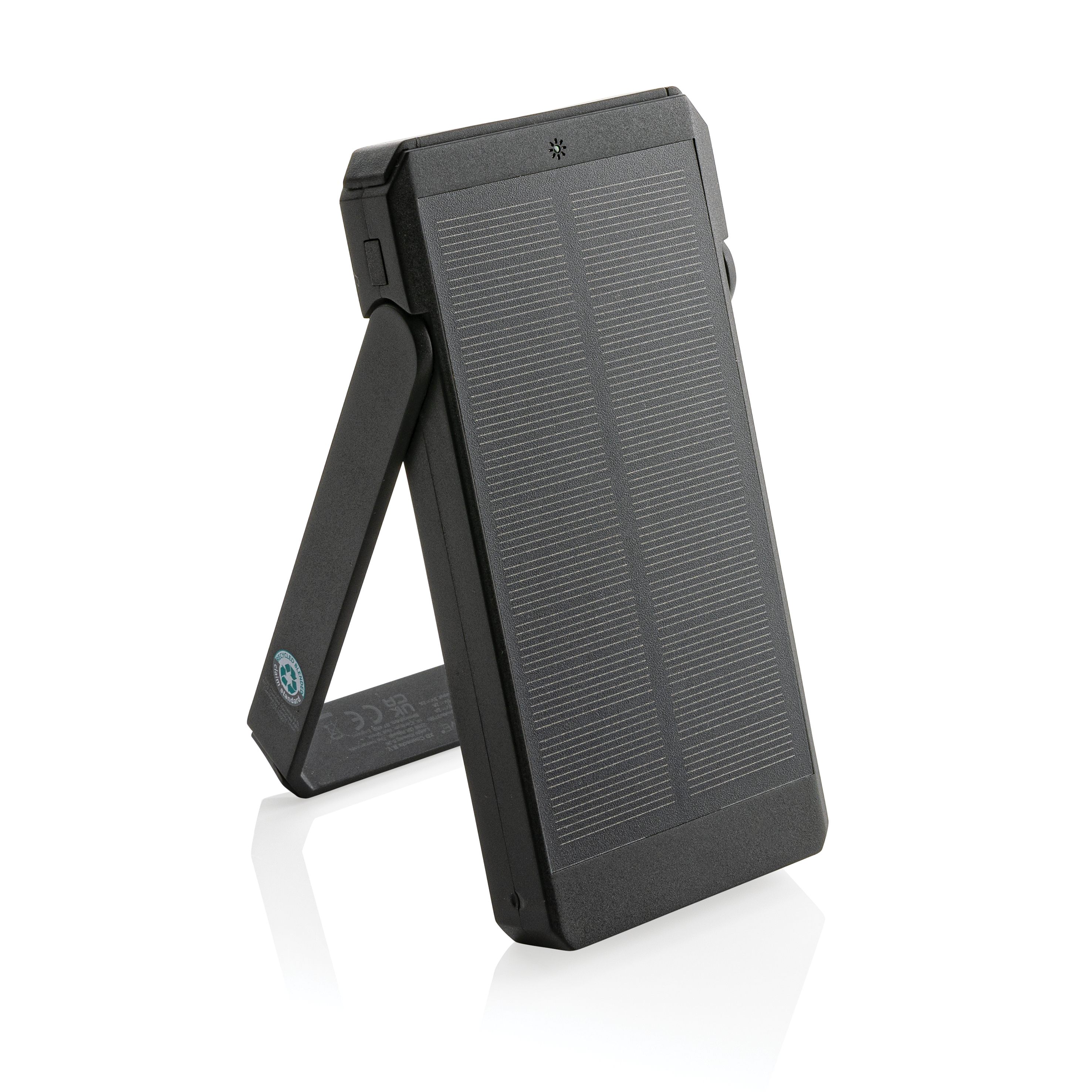 Powerbank solar de 10.000 mah fabricado con ABS reciclado certificado RCS. Contenido reciclado total: 18% basado en el peso total del artículo. La certificación RCS garantiza una cadena de suministro completamente certificada de los materiales reciclados. La batería utiliza paneles solares monocristalinos de alta calidad con una tasa de conversión del 19%. La tasa de carga depende de las condiciones. Con función de soporte integrada para utilizar los paneles solares en un ángulo óptimo. El powerbank contiene una batería de litio de 10.000 mAh de grado A de larga duración. Velocidad de carga solar: 5V/200mA. Entrada tipo C: 5V/2A. Salida: USB A: 5V/2A Tipo C: 5V/2A. Artículo y accesorios libres de PVC. Incluye cable de carga de TPE reciclado certificado por RCS. Presentado en envase mixto FSC®. Diseño registrado®