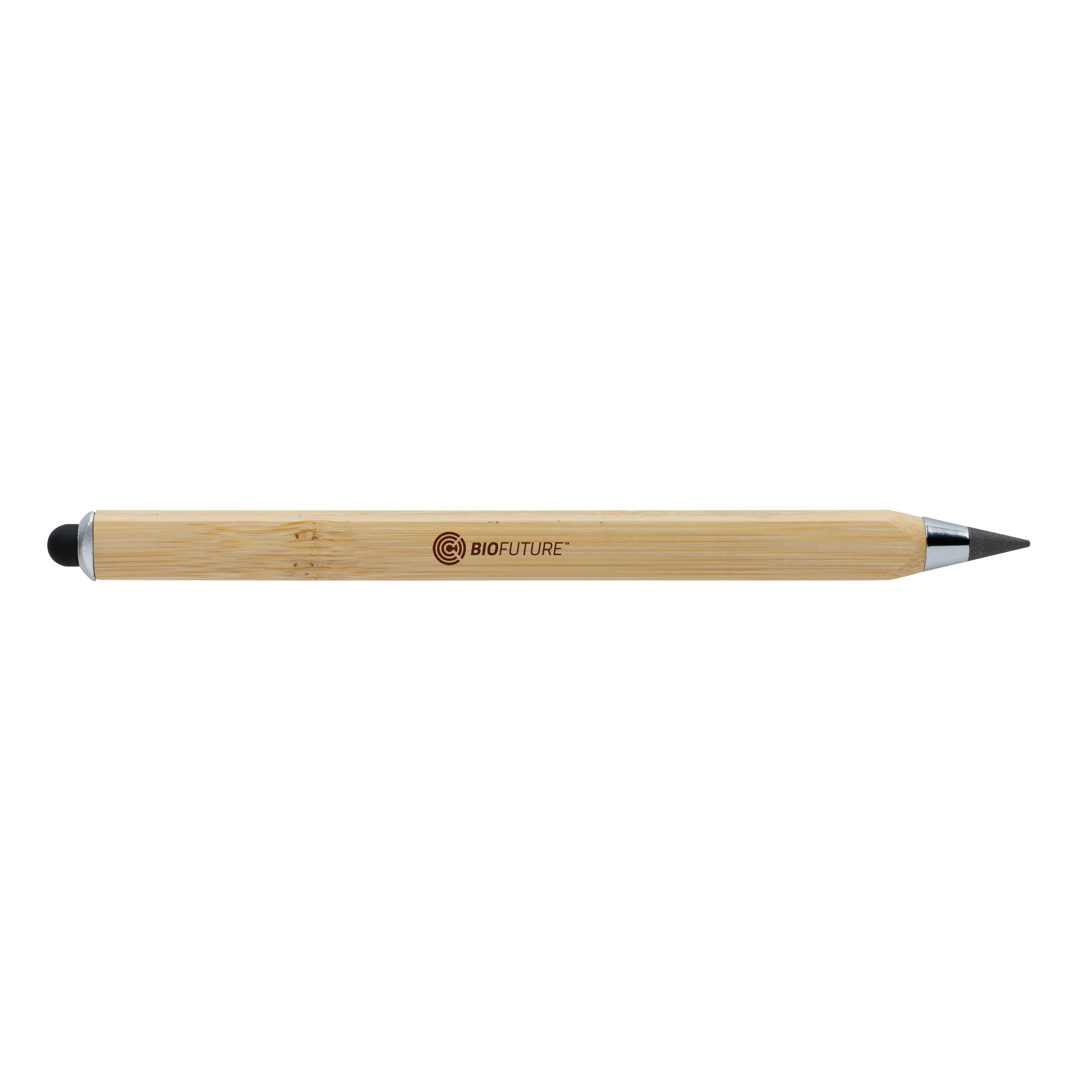 Bolígrafo infinito moderno hecho con bambú 100% certificado FSC®. Cuerpo en forma de triángulo. En un lado con indicación con cm y el otro con pulgadas. Los lápices de madera tradicionales escriben solo hasta alrededor de 200 metros, pero este lápiz Tree free infinity tiene una longitud de escritura de hasta alrededor de 20.000 metros usando una punta de grafito para. No solo escribe como un lápiz, sino que las marcas se pueden borrar. Funciona dejando una línea de grafito en el papel como un lápiz de madera tradicional normal, pero se desgasta tan lentamente que debería durar más que 100 lápices de madera tradicionales. Con punta táctil para operar dispositivos móviles. Presentado en envase mixto FSC®.