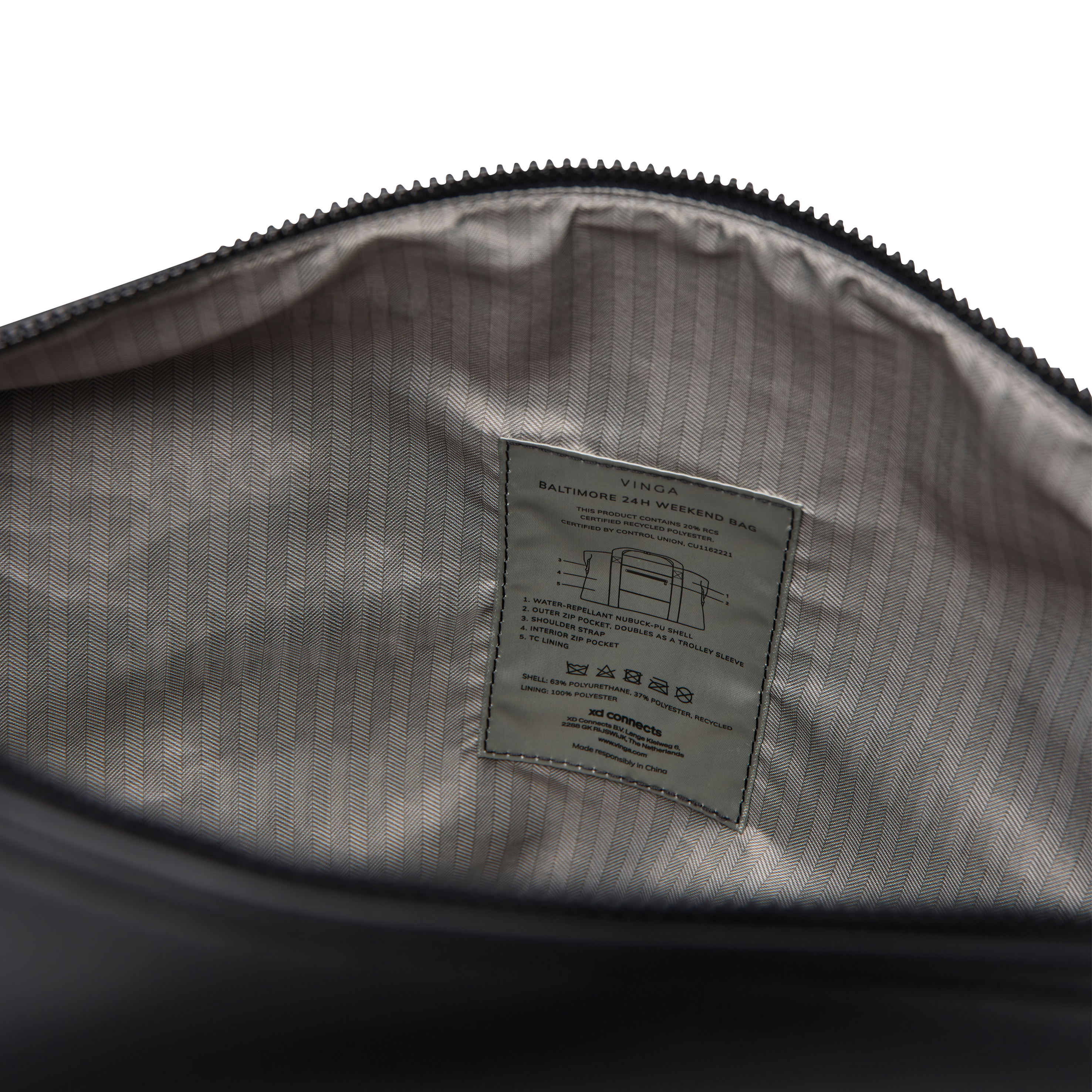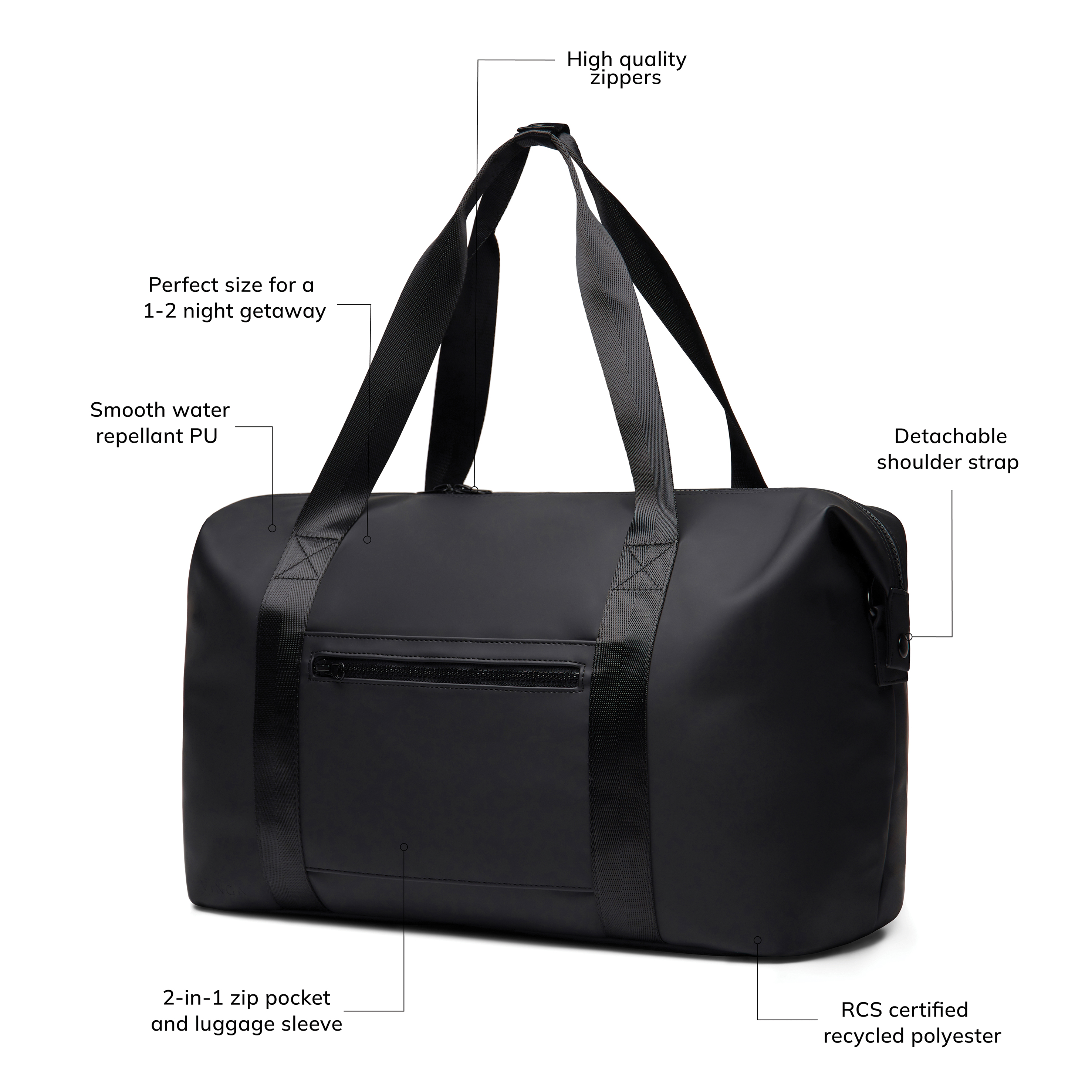 Una bolsa de viaje de fin de semana confeccionada en parte con poliéster reciclado certificado por RCS con un elegante revestimiento de PU. Diseñada para guardar todo lo que necesitas para una escapada de 1 o 2 noches. Simplemente fija tu bolsa a tu trolley con un ingenioso bolsillo con cremallera 2 en 1. Cuenta con cómodas correas de mano para llevarla y una correa de hombro ajustable y desmontable. En el interior hay un bolsillo con cremallera más pequeño para tus artículos esenciales. Certificada por RCS (Recycled Claim Standard), la certificación RCS garantiza que toda la cadena de suministro de materiales reciclados está certificada. El contenido reciclado total se basa en el peso total del producto. Este producto contiene un 20% de poliéster reciclado certificado por RCS.