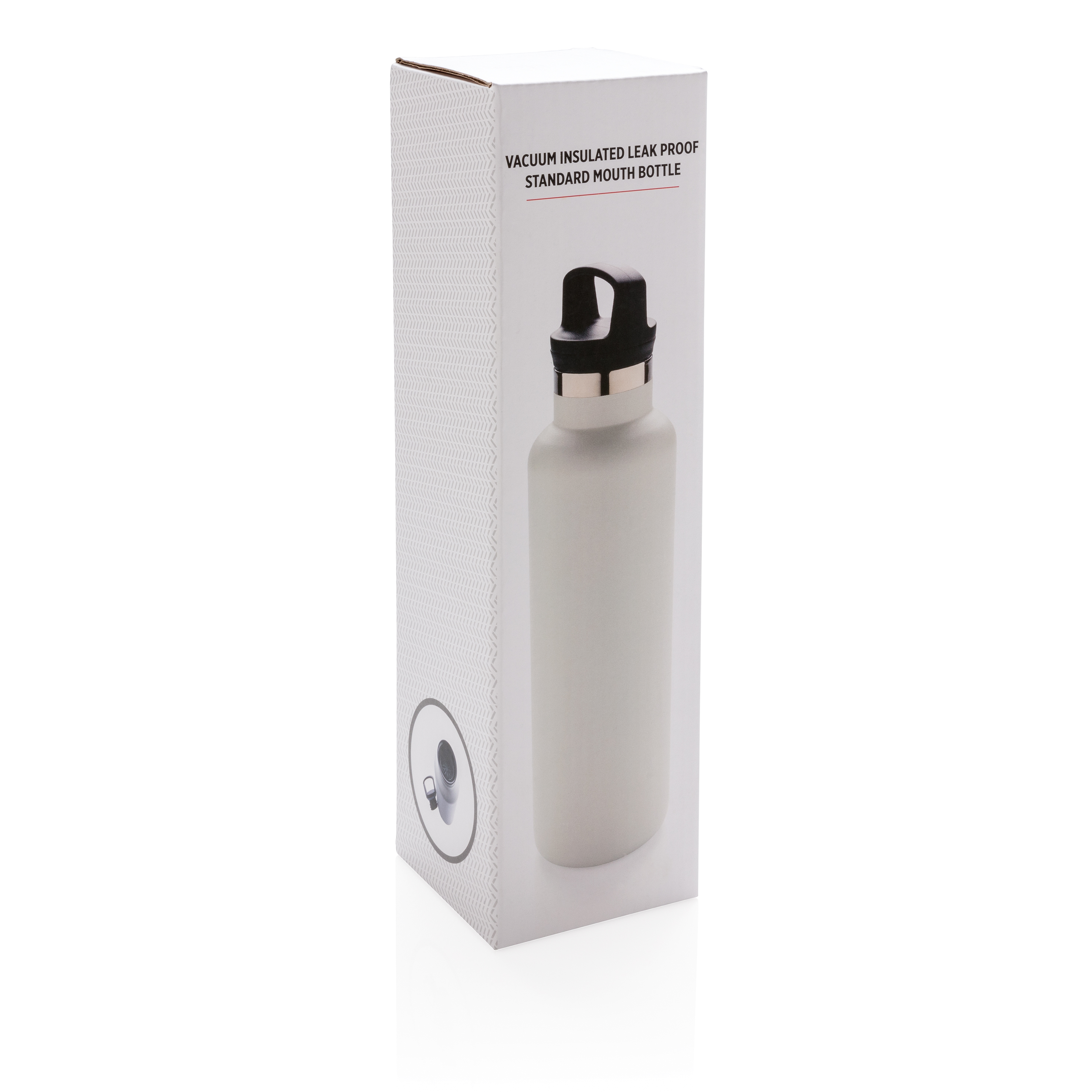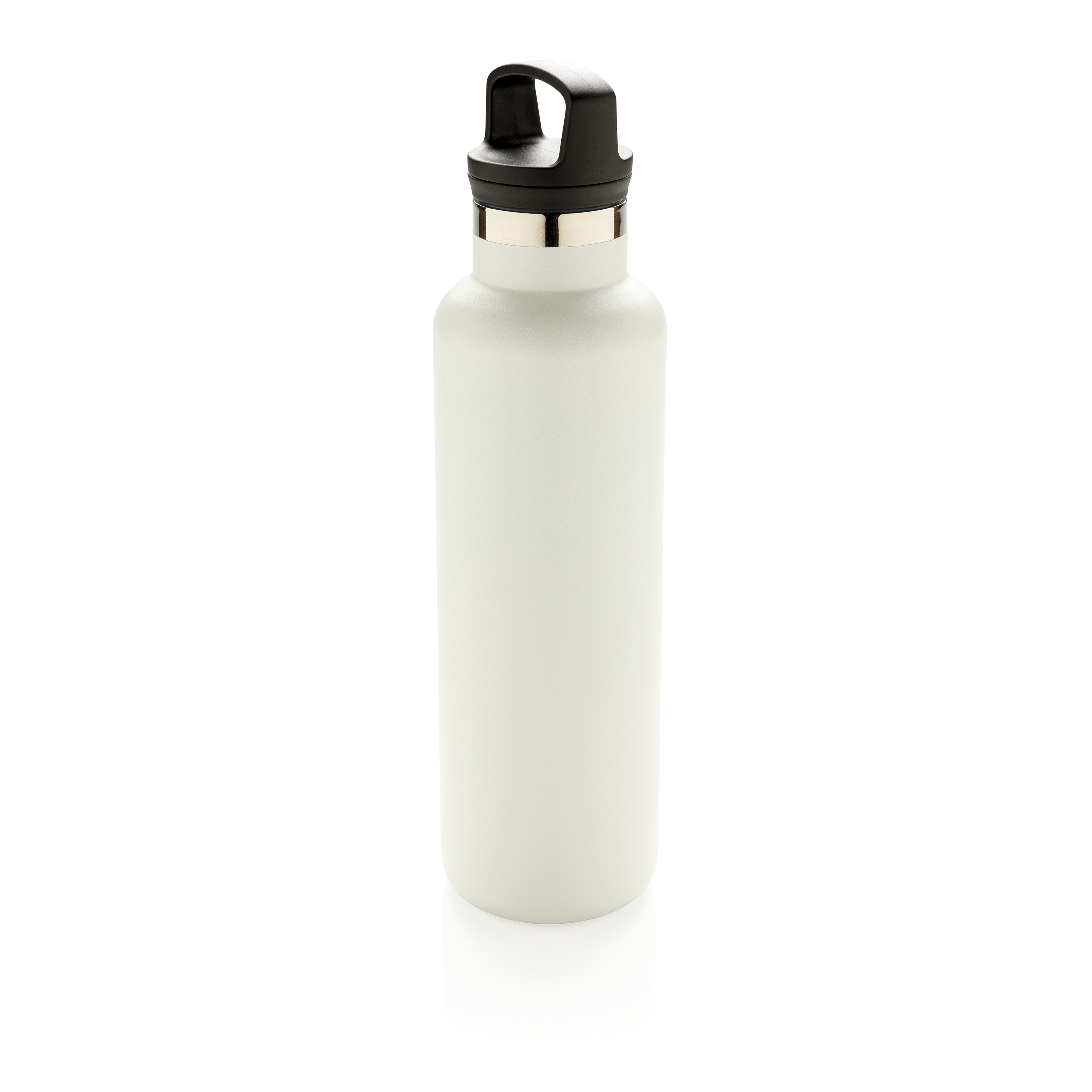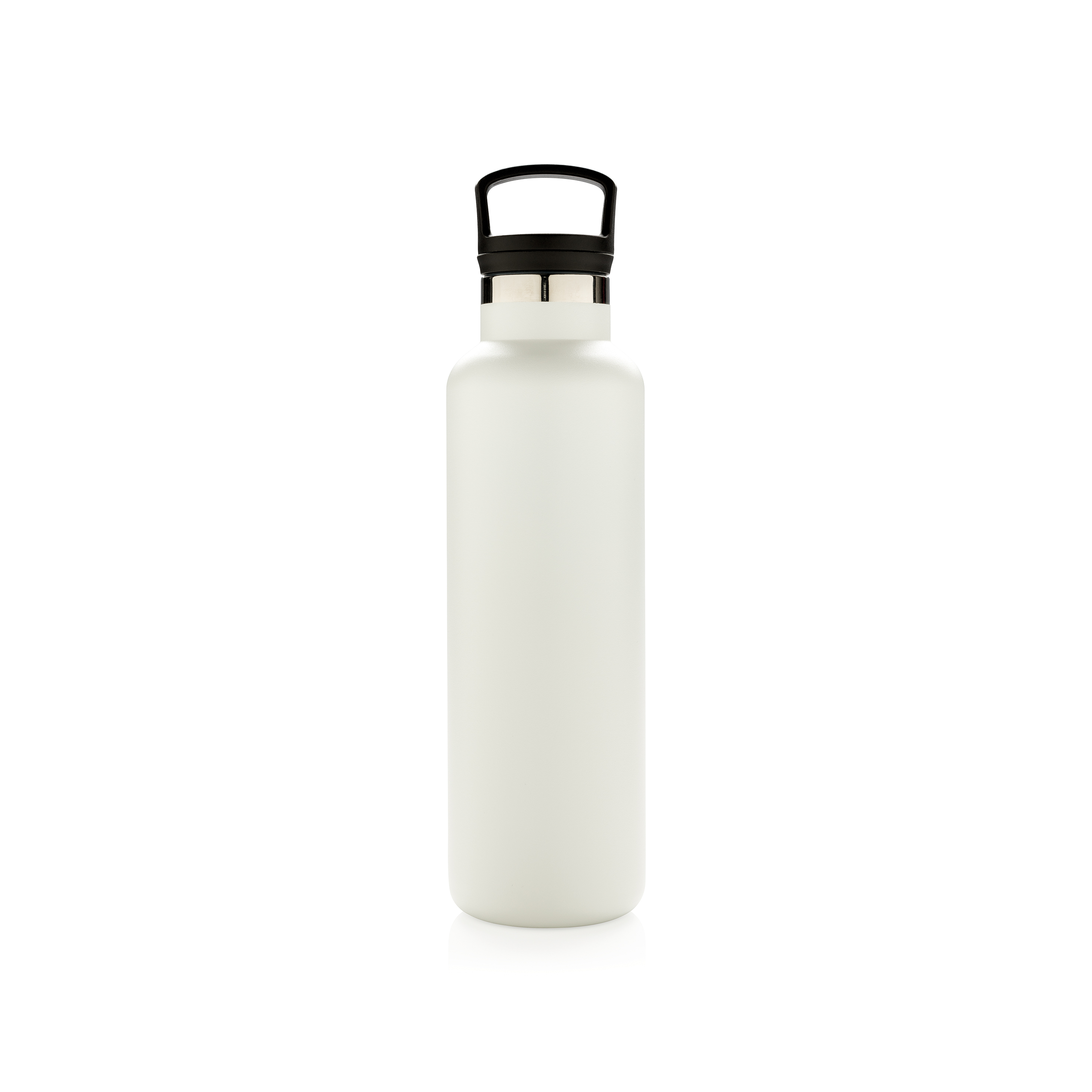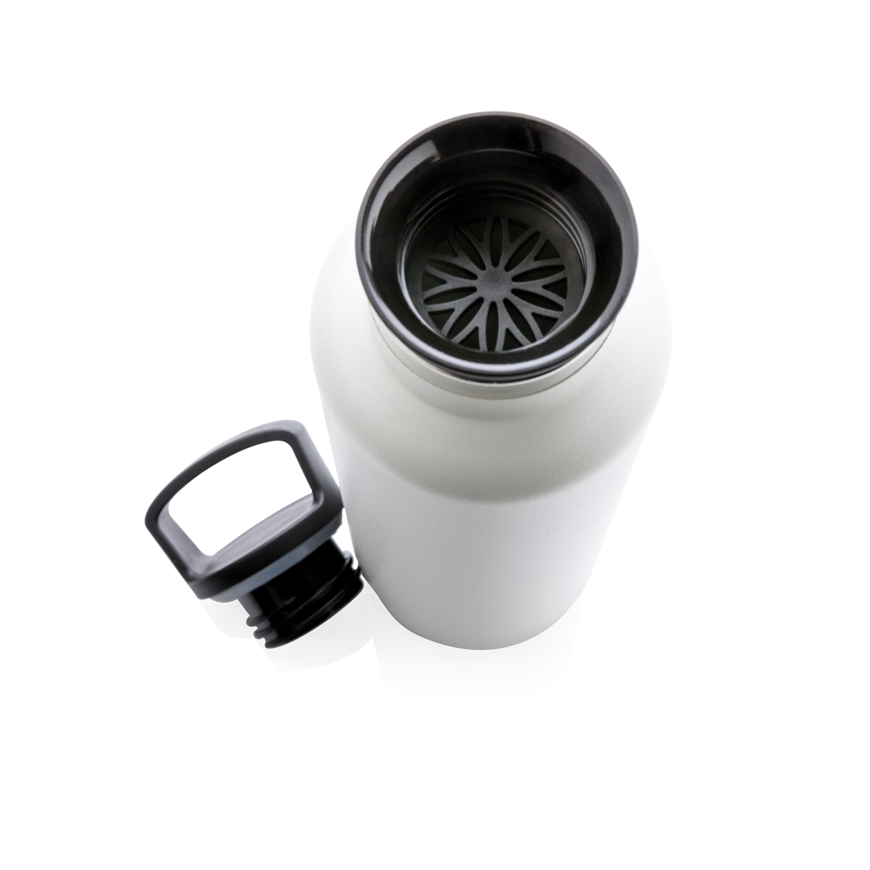 Botella con recubrimiento de polvo de doble pared al vacío. Tapa 2 en 1 con filtro perfecto para té caliente o infusión. Abertura de boca estándar ideal para beber y agregar cubitos de hielo. Botella resistente para cualquier temporada del año. Su 304 SS interior y 201 SS exterior mantiene tus bebidas calientes 5h y frías 15h. En múltiples colores. La botella de color blanquecino está en PMS Cool Grey 1. Capacidad: 600 ml.