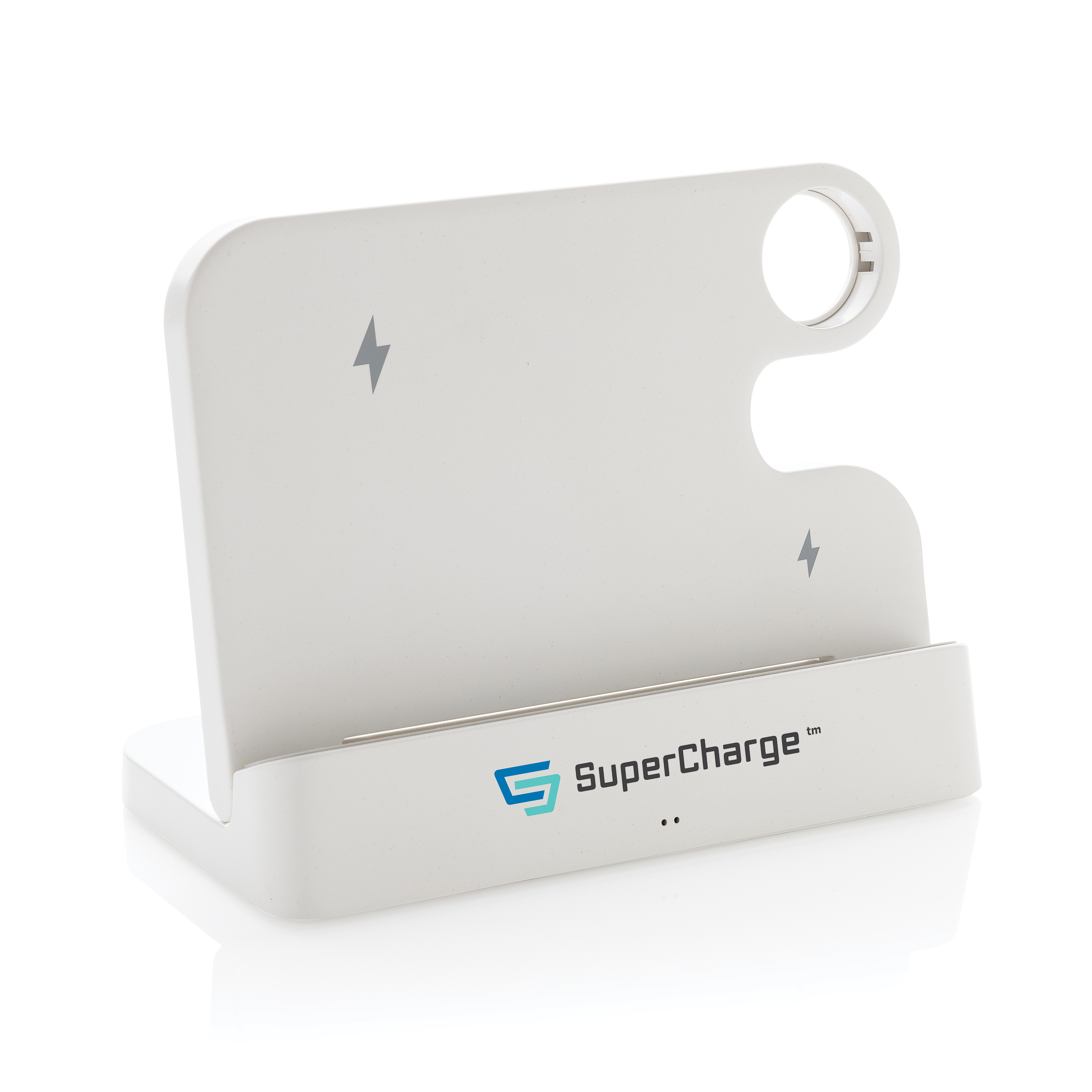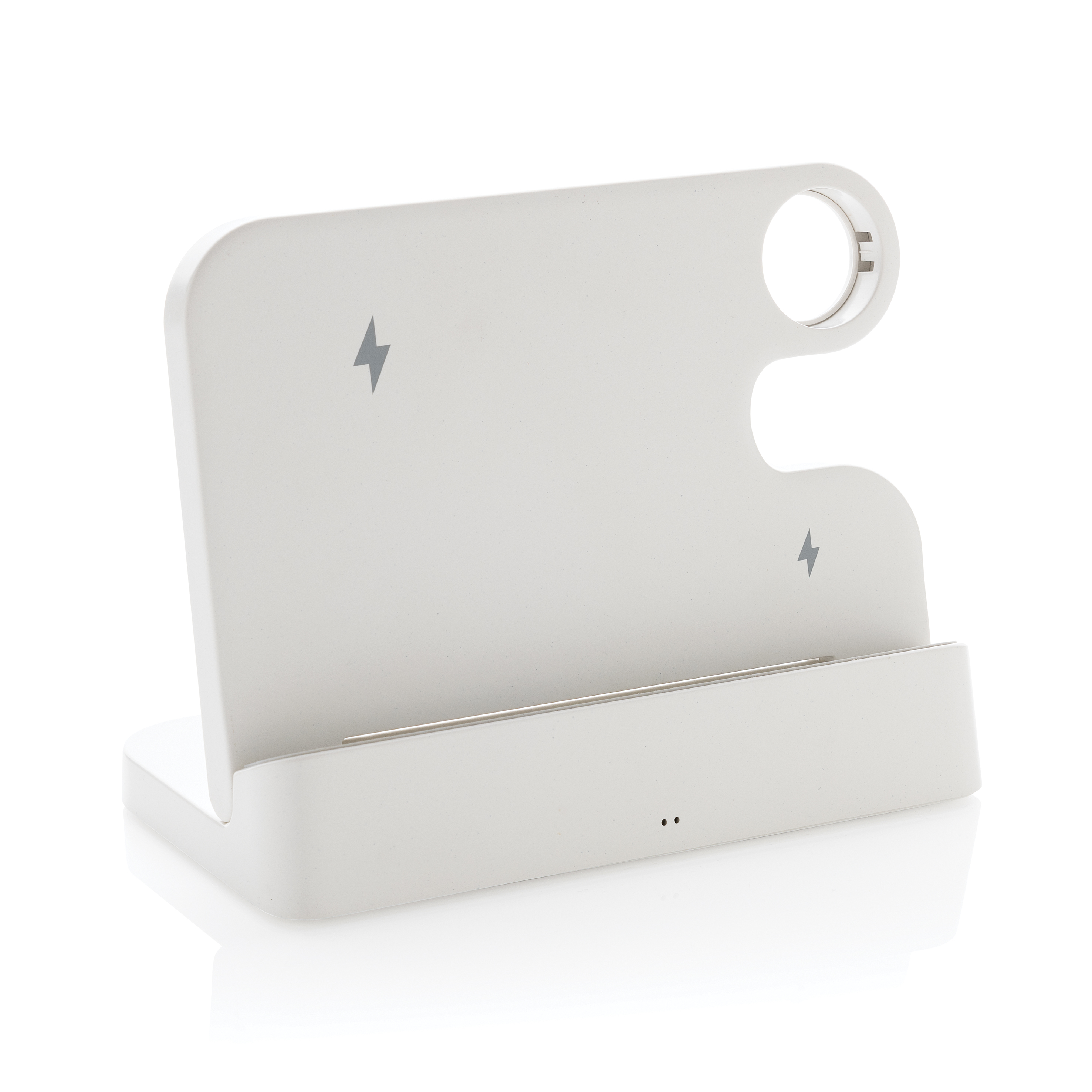 Soporte de carga de diseño plegable con cargador inalámbrico de 15W fabricado con ABS reciclado. Con un segundo cargador inalámbrico de 5W para cargar objetos más pequeños como auriculares. Con ranura para iWatch para colocar el cable de carga oficial para iWatch. En la parte posterior hay un puerto de salida USB A y USB C de 5V/1A para cargar artículos por cable. Silicona en parte inferior para evitar resbalones y amortiguación de silicona en el soporte para mantener tu teléfono en perfectas condiciones. Contenido reciclado total: 80% basado en el peso total del artículo. La certificación RCS garantiza una cadena de suministro de materiales reciclados completamente certificada. Incluye cable de carga USB A a USB C de TPE reciclado de rcs de 120 cm. Presentado en embalaje FSC®. Sin PVC