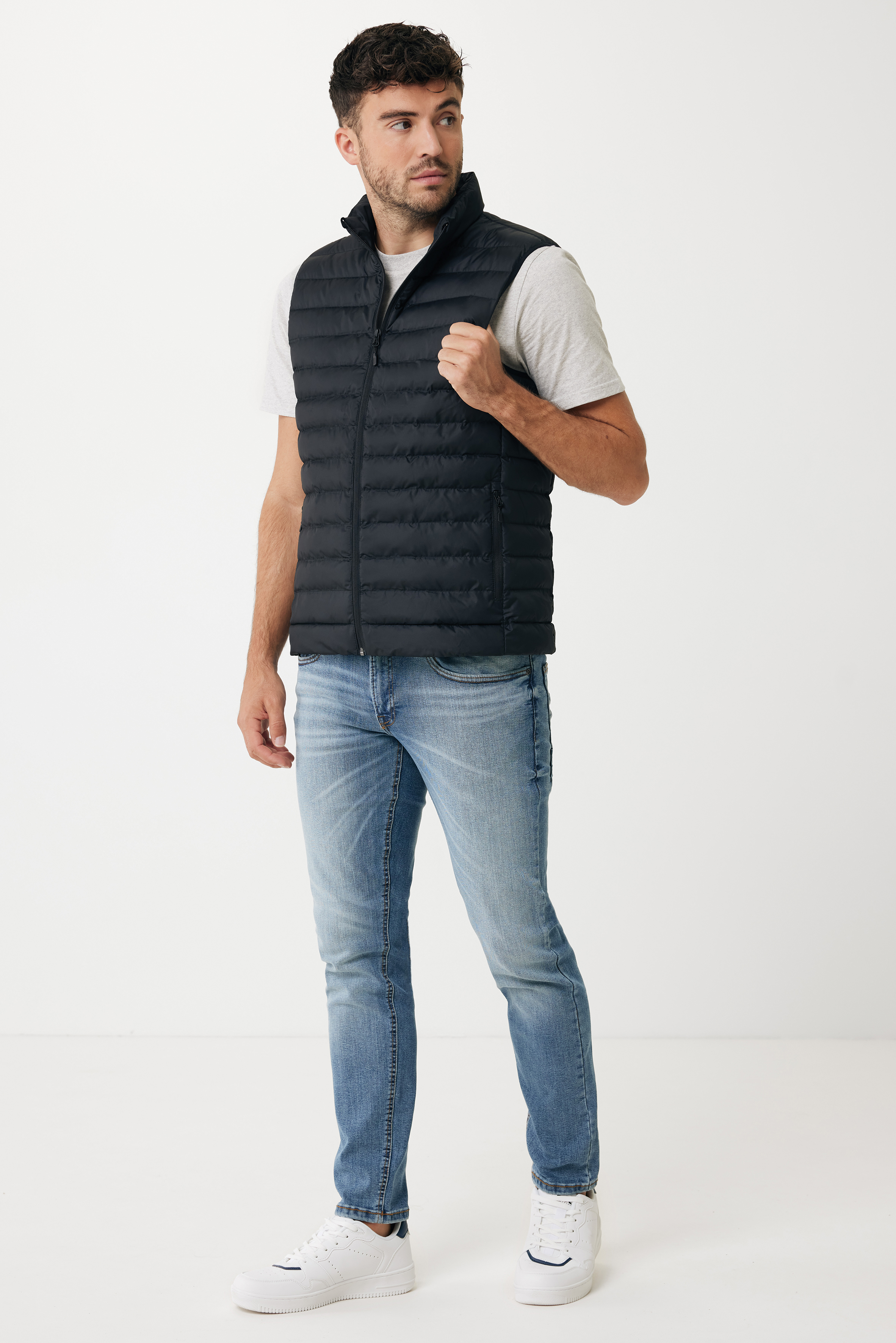 Chaleco medium fit para hombre confeccionado 100% con poliéster reciclado. Acolchado con relleno de perlas de poliéster 100% reciclado. Tiene una cremallera invertida en la parte delantera y prácticos bolsillos con cremallera en las costuras laterales. Todas las cremalleras tienen tiradores adicionales en colores a juego para una apariencia refinada. Las sisas tienen ribetes elásticos y todas las costuras del interior tienen un acabado limpio con ribetes reciclados. Impregnación repelente al agua libre de flúor/PFAS. El uso de materiales de tela reciclados genuinos y las afirmaciones de impacto ambiental están garantizados mediante el uso del trazador físico disruptivo AWARE™ y la tecnología blockchain. Al escanear el código QR, obtendrás acceso a un pasaporte digital exclusivo. El 2% de los ingresos de cada producto vendido se donará a Water.org. Este producto tiene la certificación OEKO-TEX® STANDARD 100. El chaleco. También está disponible para mujer.
