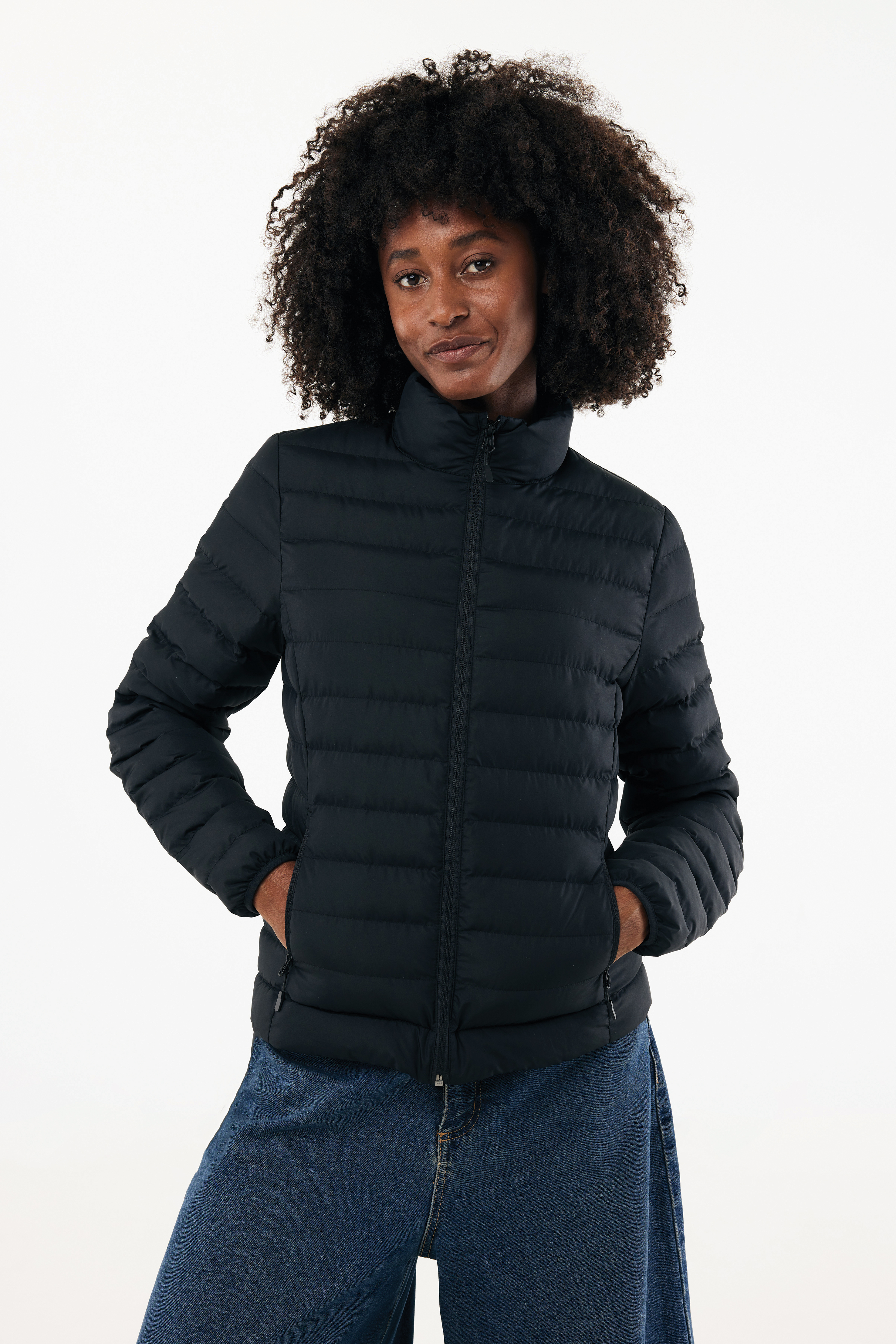 Chaqueta acolchada de corte medio para mujer, confeccionada con 100% poliéster reciclado posconsumo. Está completamente acolchada con relleno de poliéster 100% reciclado. Presenta una cremallera invertida en la parte delantera y prácticos bolsillos con cremallera en las costuras laterales. Todas las cremalleras cuentan con tiradores adicionales a juego para un look refinado. Los puños tienen ribete elástico y todas las costuras interiores tienen un acabado impecable con ribete reciclado. Impregnación hidrófuga sin flúor ni PFAS. El uso de materiales textiles reciclados genuinos y las declaraciones de impacto ambiental están garantizadas mediante el uso del trazador físico disruptivo AWARE™ y la tecnología blockchain. Al escanear el código QR, accederás a un pasaporte digital específico. El 2% de los beneficios de cada producto vendido se donará a Water.org. Cuenta con la certificación OEKO-TEX® STANDARD 100. La chaqueta acolchada Maiko también está disponible en talla para hombre.