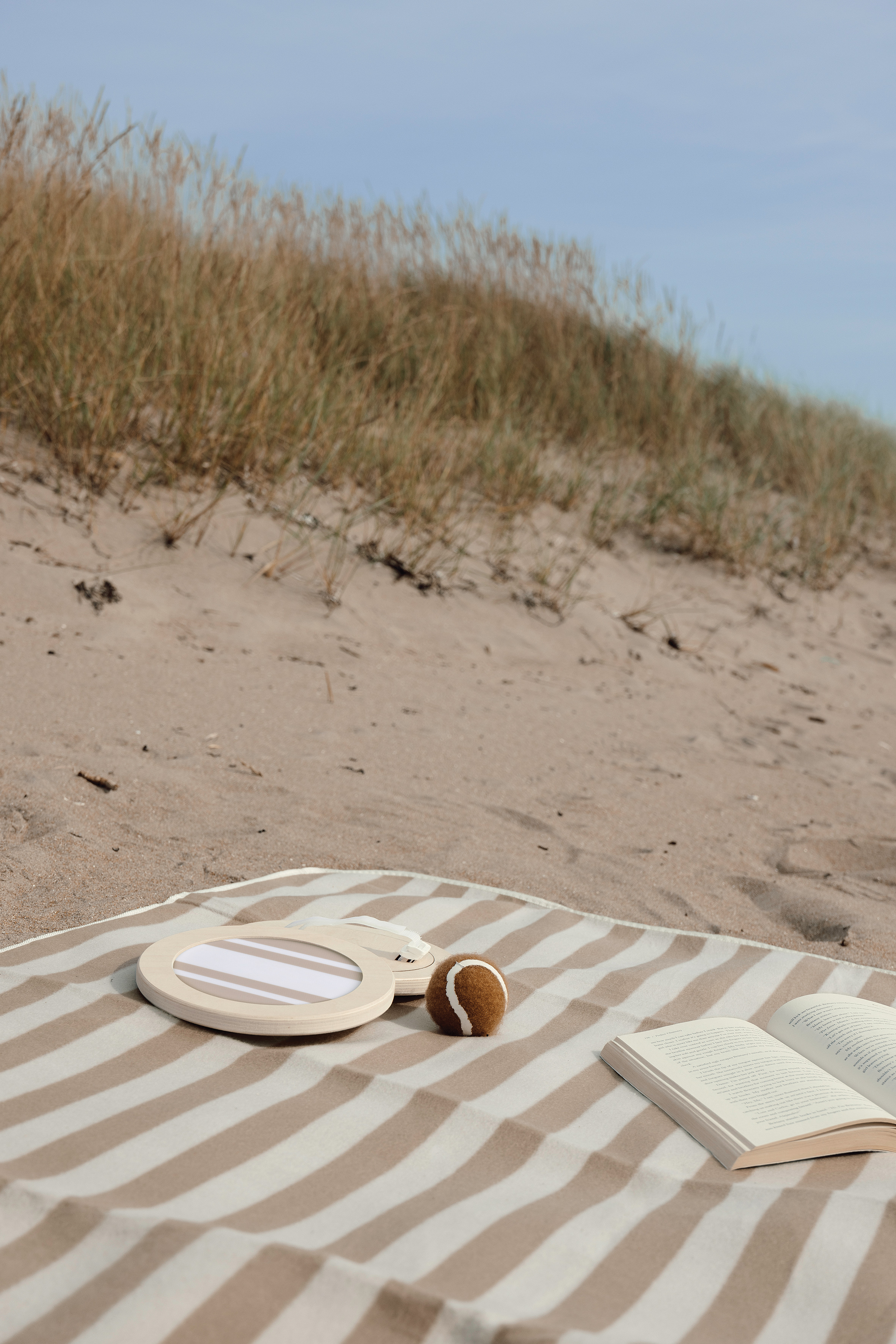Este es el juego de exterior ideal para llevar a la playa o al parque. Incluye una pelota y dos recogedores con velcro, fabricados con madera contrachapada con certificación FSC®. El diseño es deportivo pero refinado, con un patrón de rayas de dos tonos en los recogedores y una pelota marrón a juego. El juego se presenta cómodamente en una bolsa de lona con una parte posterior de malla para que sea fácil de llevar. Se incluye un folleto de instrucciones.