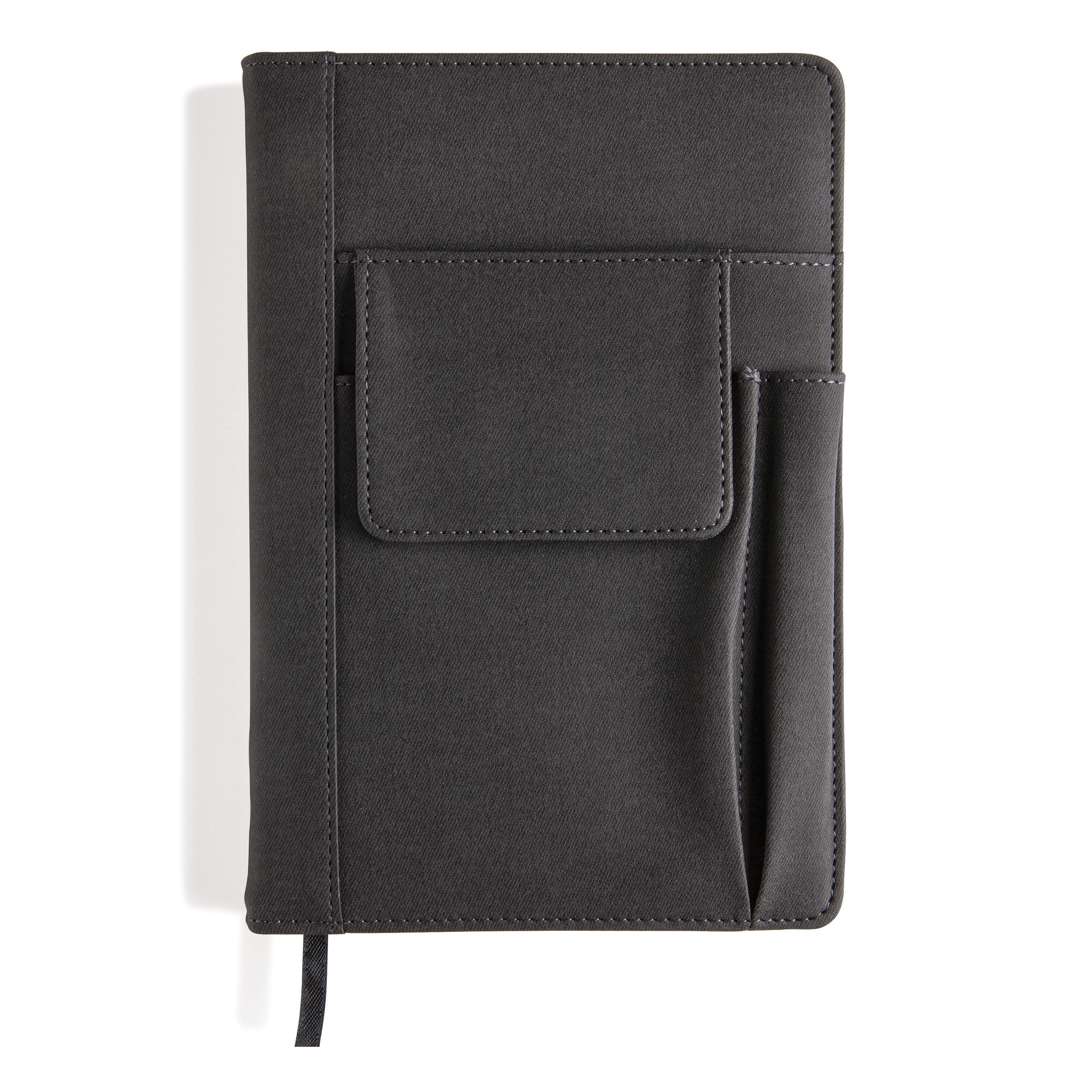 Libreta PU con un bolsillo frontal para teléfono (14x10cm), apartado para bolígrafo y un bolsillo principal para powerbank o tarjetas de visita. Divisor negro y 160 páginas de 80g/m2 en el interior. Tapa reutilizable al poder sustituir el bloc de notas interior.