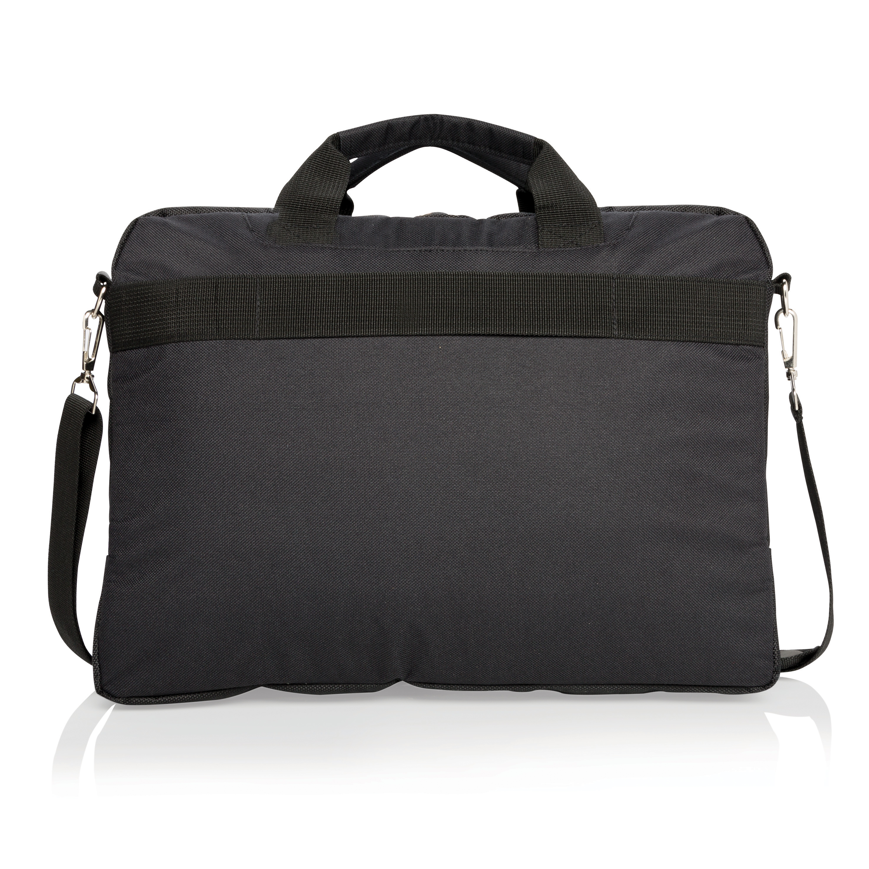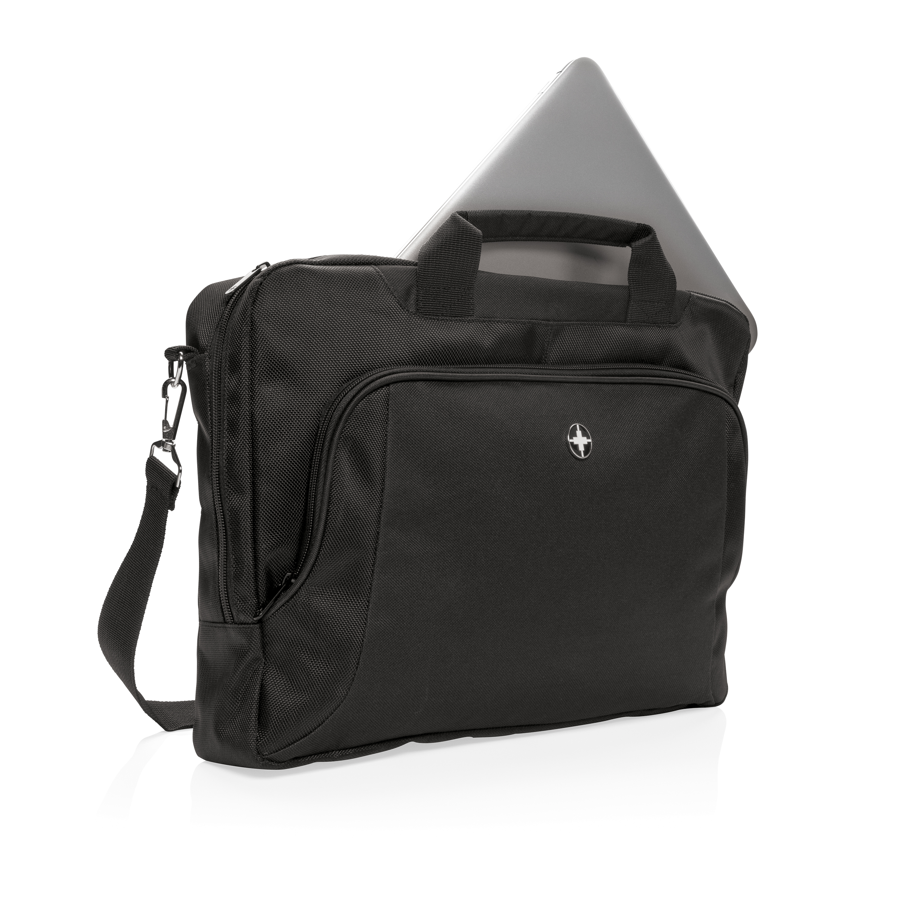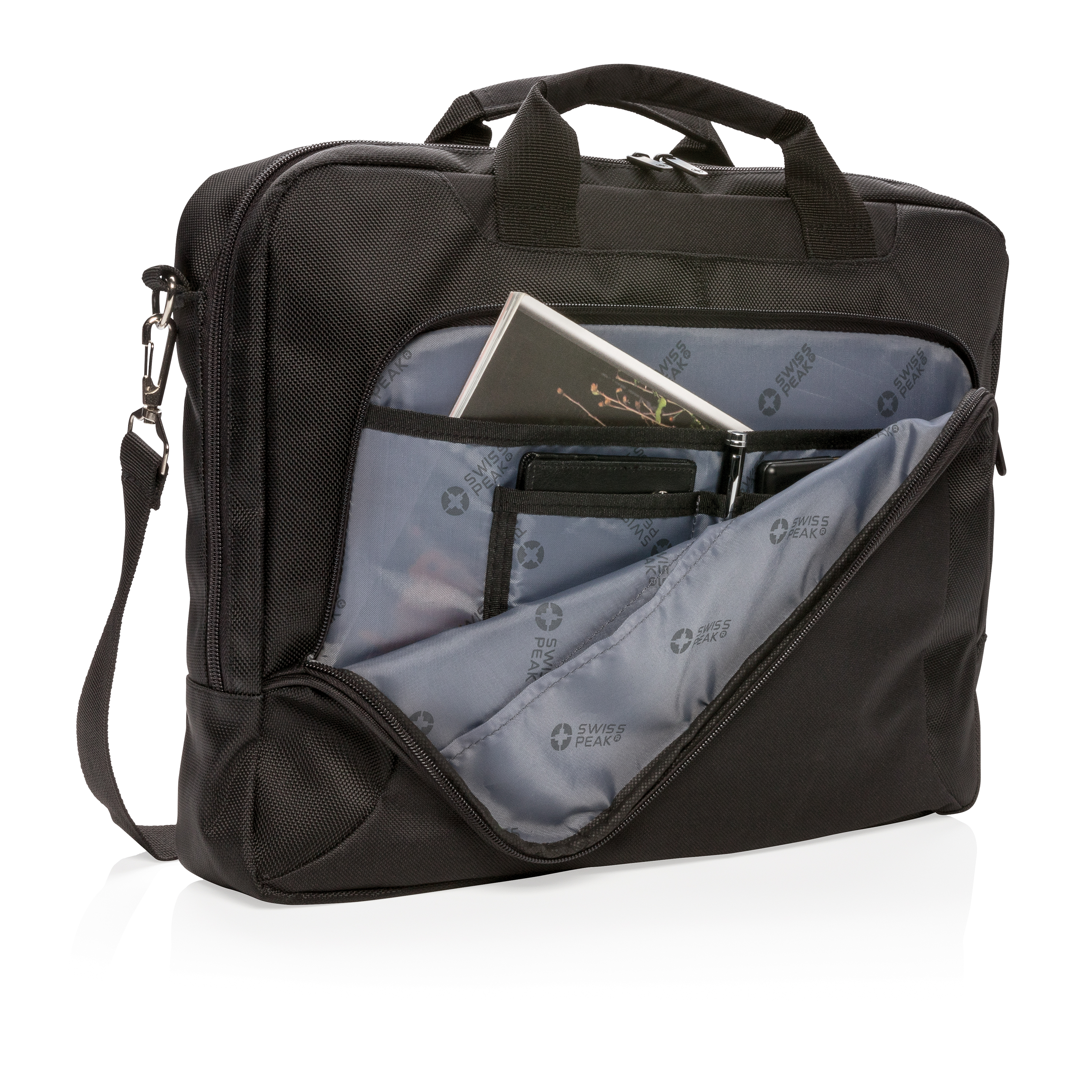 Lujosa bolsa 1680D para portátil hasta 15.6” con múltiples compartimentos, apartado acolchado y espacio suficiente para tus pertenencias. Dispone también de compartimento frontal con cremallera para guardar objetos de valor. Sin PVC.