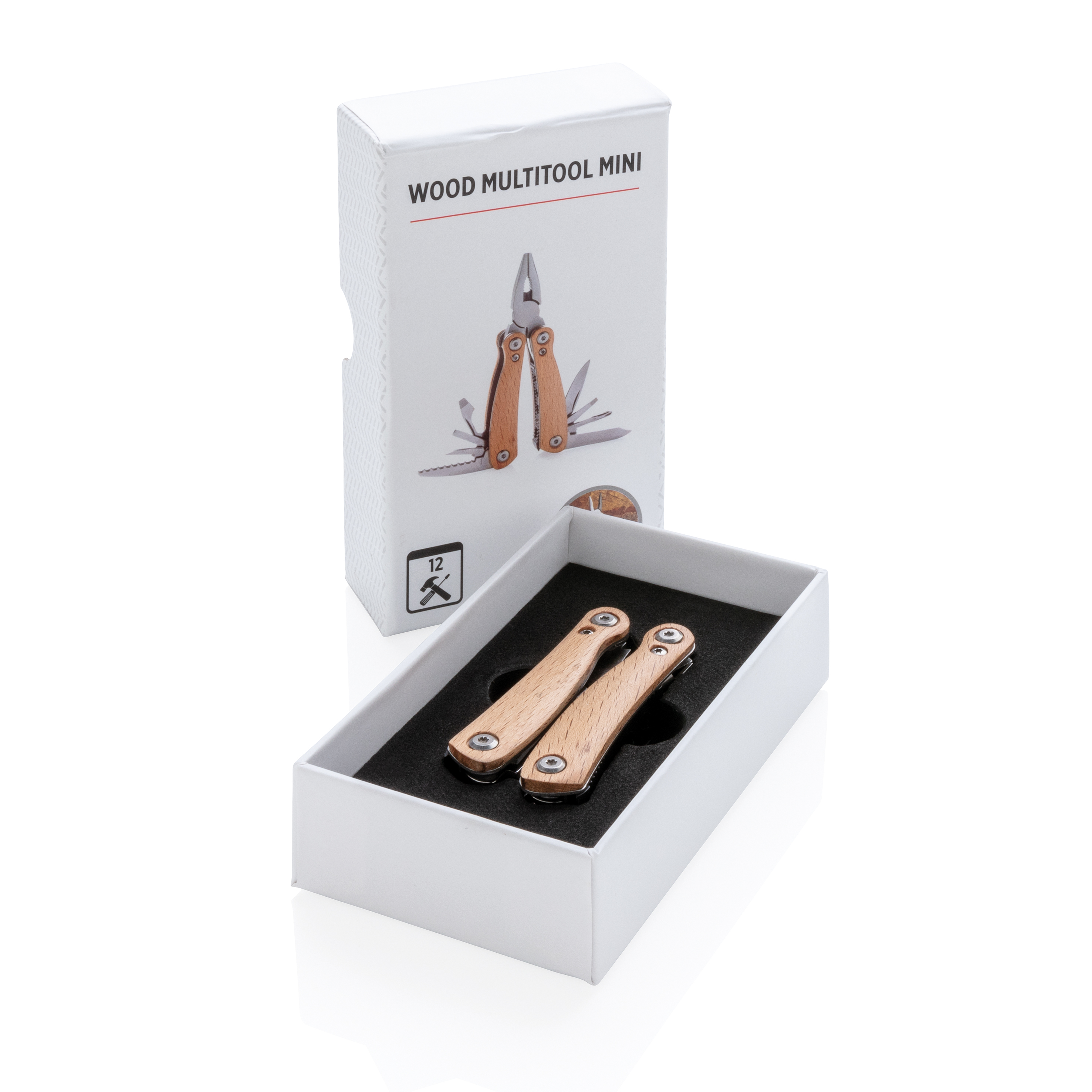 Multiherramienta compacta y duradera con 12 funciones. Carcasa de madera y herramientas de acero inoxidable de alta calidad. Incluye: alicates de punta fina, alicates normales, cortaalambres, cuchillo de sierra, navaja pequeña, destornillador, destornillador plano mediano, destornillador plano pequeño, destornillador plano grande, navaja, lima y pulidora. Presentado en caja de regalo.