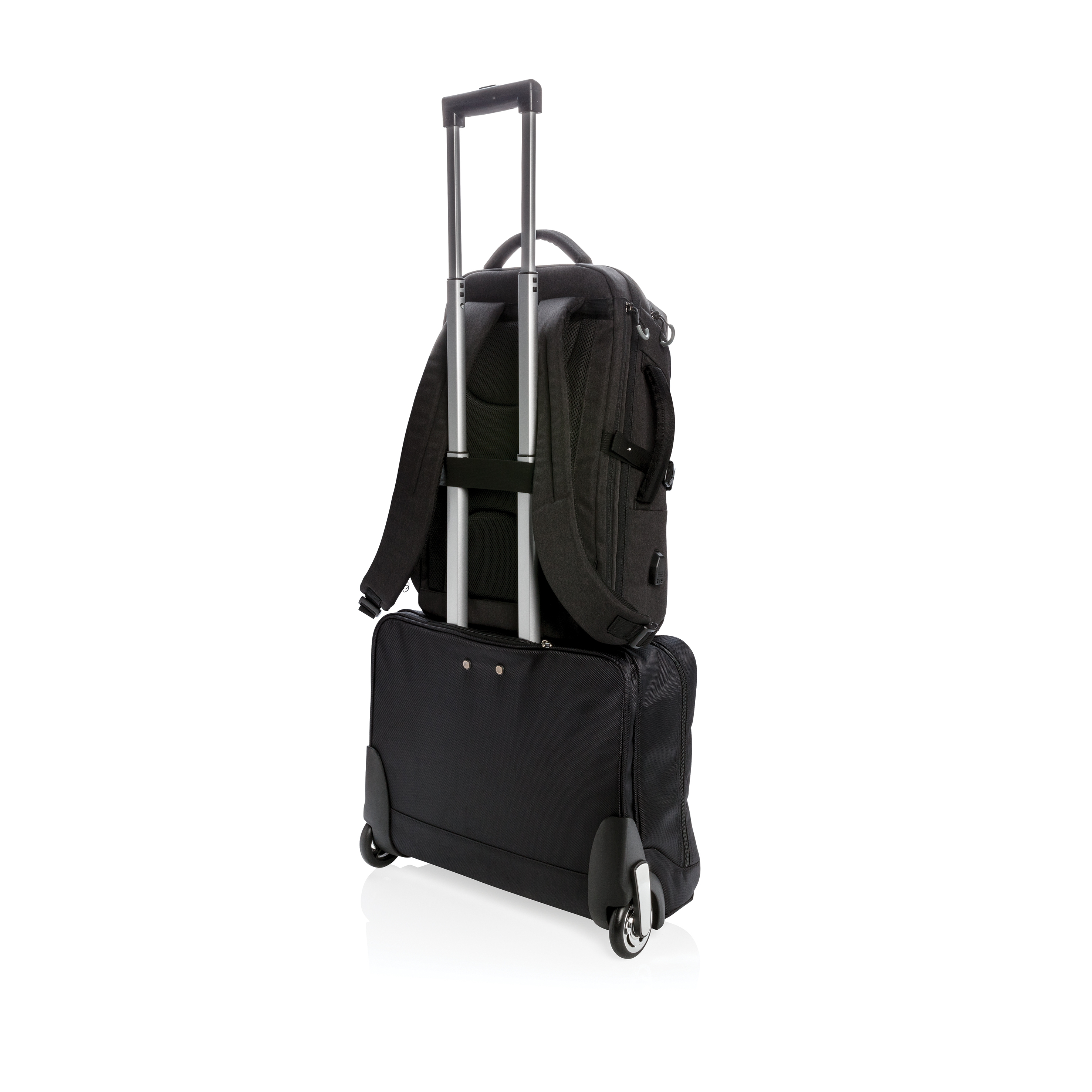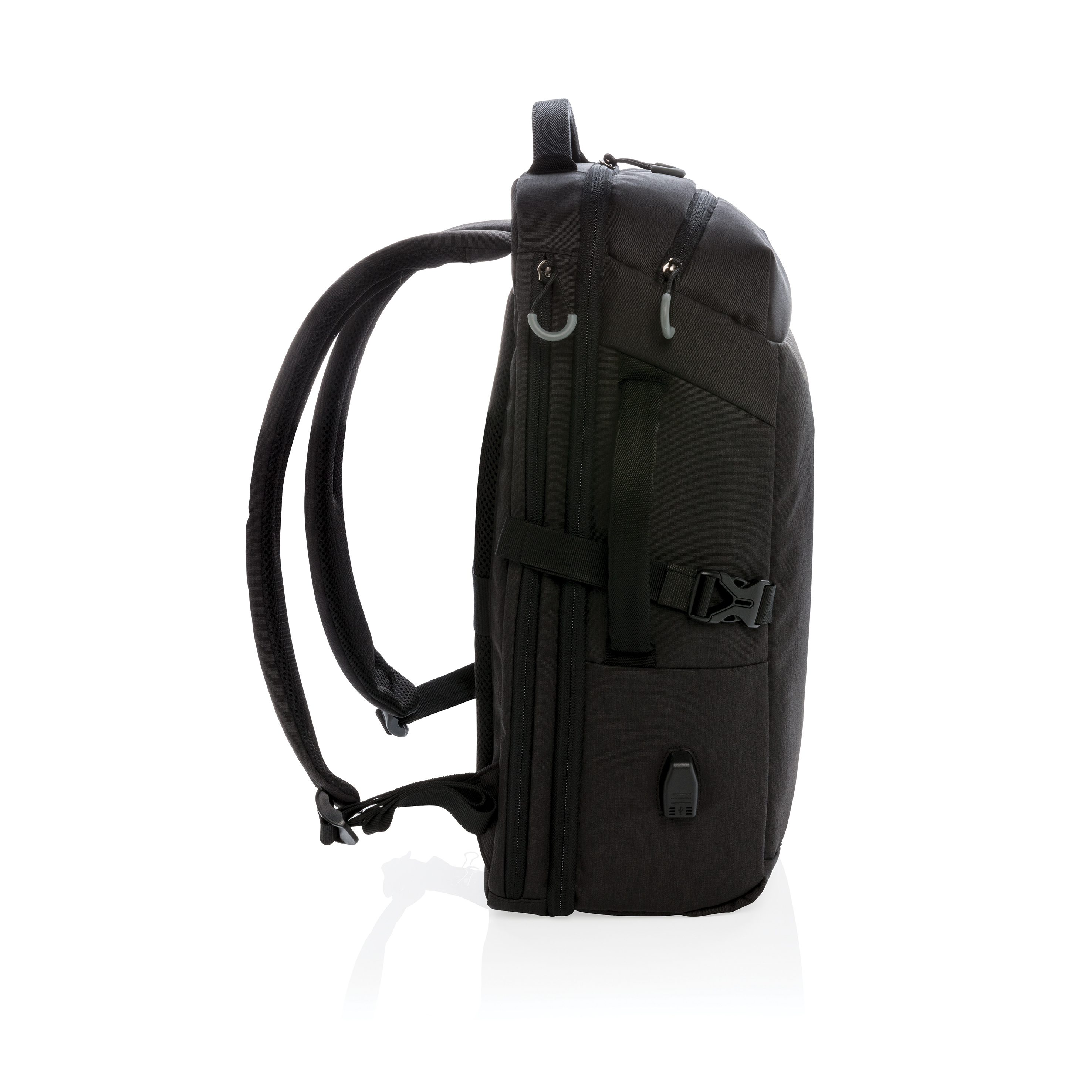 Esta mochila está diseñada para viajes diarios o de fin de semana. Está diseñada con un compartimento acolchado para ordenador portátil de 17″ para proteger tu dispositivo. Tiene la capacidad de una trolley sin el peso de las ruedas y el asa, además, el uso de una mochila la hace más móvil, manos libres y simplifica tu experiencia de viaje. Deja tus ruedas en casa y viaja fácilmente. Incluye correa para trolley, bolsillo lateral para botella de agua y salida USB A. Bolsillo superior de acceso rápido, bolsillo frontal con cremallera y bolsillos protegidos por RFID. Con marcador AWARE™ que valida el uso genuino de materiales reciclados. Cada bolsa reutiliza 35,5 botellas de PET de 0,5 L. El 2% de las ganancias de cada producto Impact vendido se donará a Water.org. Sin PVC.