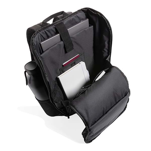 Esta moderna y minimalista mochila para ordenador portátil de poliéster reciclado te acompaña en cada viaje o reunión. Con profundos bolsillos frontales verticales y una elegante parte superior con cremallera fácil de abrir. Revela un espacioso interior completo con secciones para un ordenador portátil y un iPad. Incluye bolsillos con protección RFID en el interior. Con trazador AWARE™ que valida el uso genuino de materiales reciclados. Cada bolsa reutiliza 21,4 botellas PET. El 2% de las ganancias de cada producto Aware™ vendido se donará a Water.org. Libre de PVC.