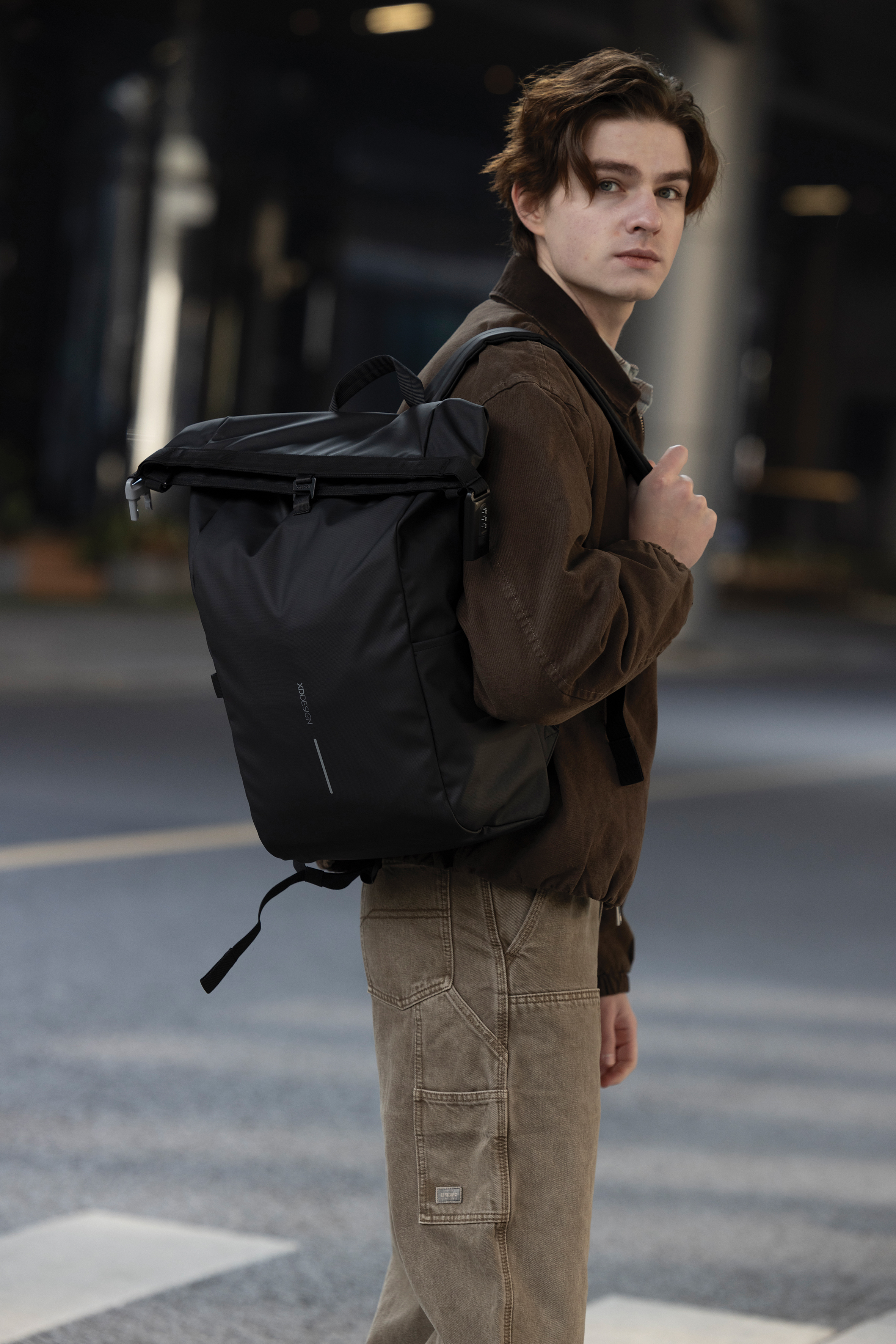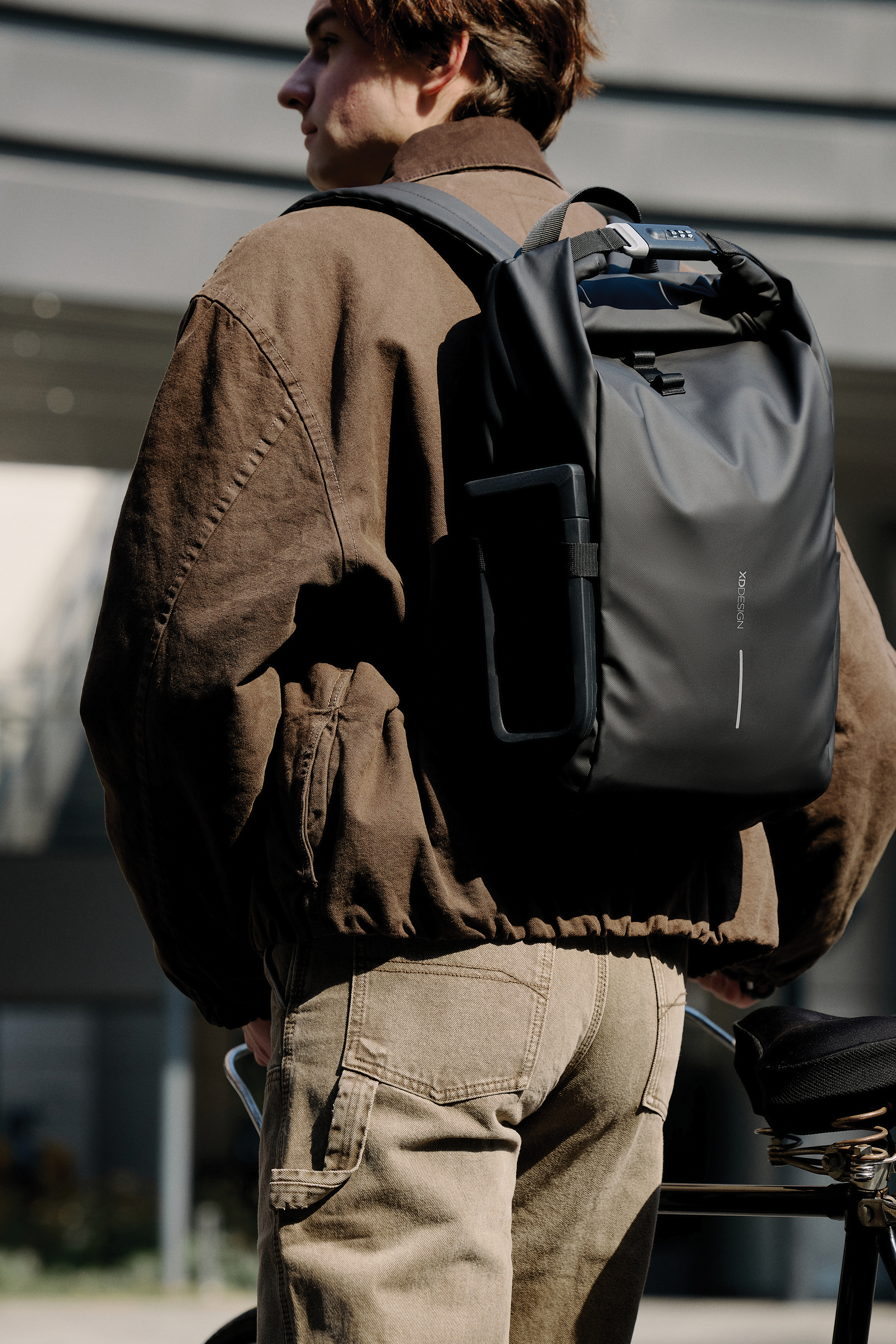 La mochila para bicicleta Urban Water Resistant es la compañera de viaje ideal, ya que garantiza seguridad y comodidad. Al enrollar el compartimento principal y asegurarlo con el candado de combinación reforzado, la mochila ofrece un cierre completo, que también se puede utilizar para bloquear la bolsa alrededor de un objeto fijo. La mochila se fija fácilmente al cuadro de la bicicleta. En el interior, compartimentos acolchados para portátil de 16″, mientras que los bolsillos de malla mantienen organizados tus elementos esenciales. El exterior minimalista está elaborado con material PU de alta calidad, resistente al agua y duradero, mientras que el forro está elaborado con AWARE™. El uso de tela reciclada genuina está garantizado. 32% de contenido reciclado. Diseño registrado®