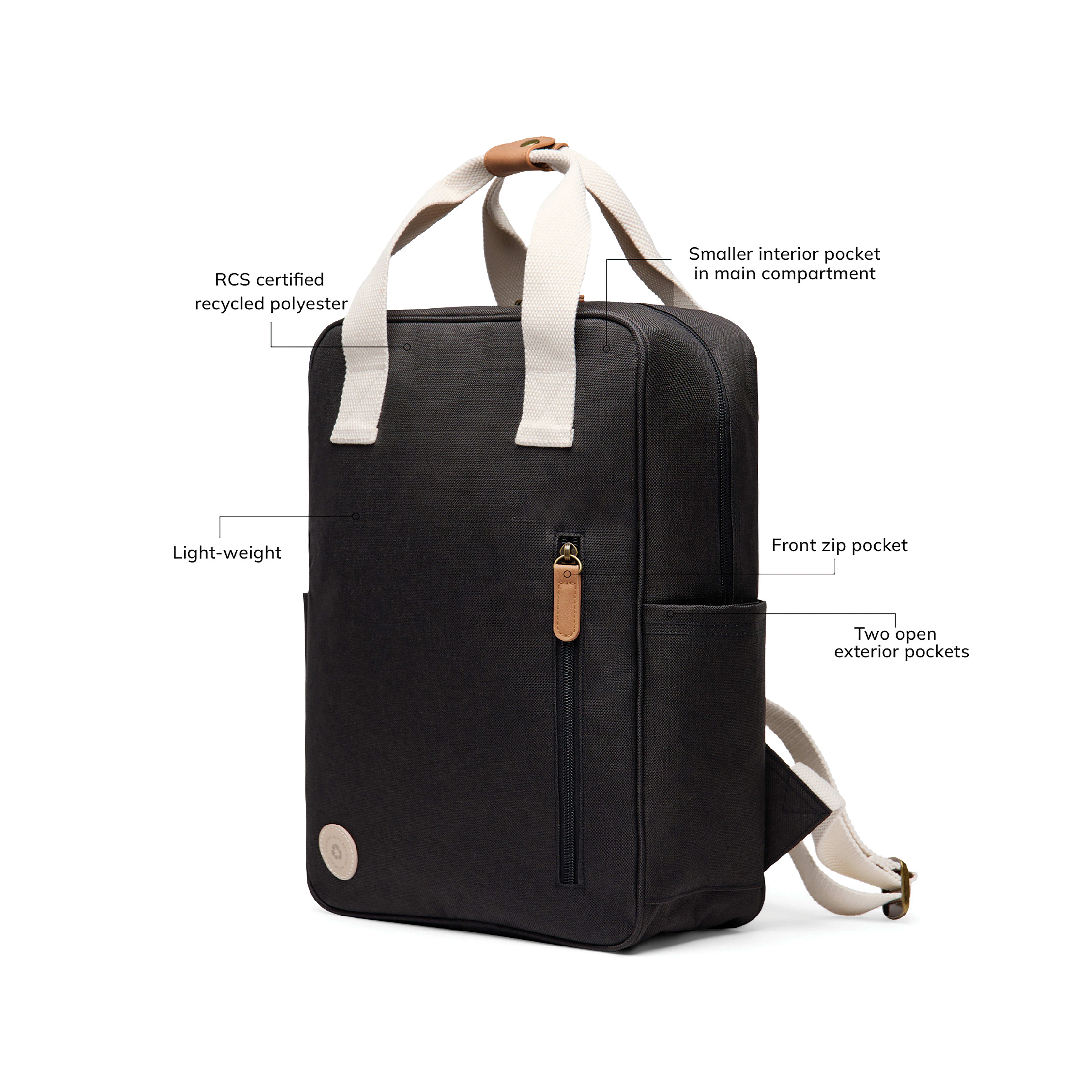 Mantén un estilo ligero con esta mochila clásica pero sutilmente deportiva, confeccionada con poliéster reciclado certificado por RCS y acentuada con detalles en contraste. La mochila ofrece un práctico bolsillo frontal con cremallera y dos bolsillos laterales abiertos para un fácil acceso. Dentro del espacioso compartimento principal hay un bolsillo más pequeño, diseñado para una fácil organización. Los detalles de metal de latón antiguo añaden un toque de sofisticación. Certificada por RCS (Recycled Claim Standard), la certificación RCS garantiza que toda la cadena de suministro de materiales reciclados está certificada. El contenido reciclado total se basa en el peso total del producto. Este producto contiene un 10% de poliéster reciclado certificado por RCS.