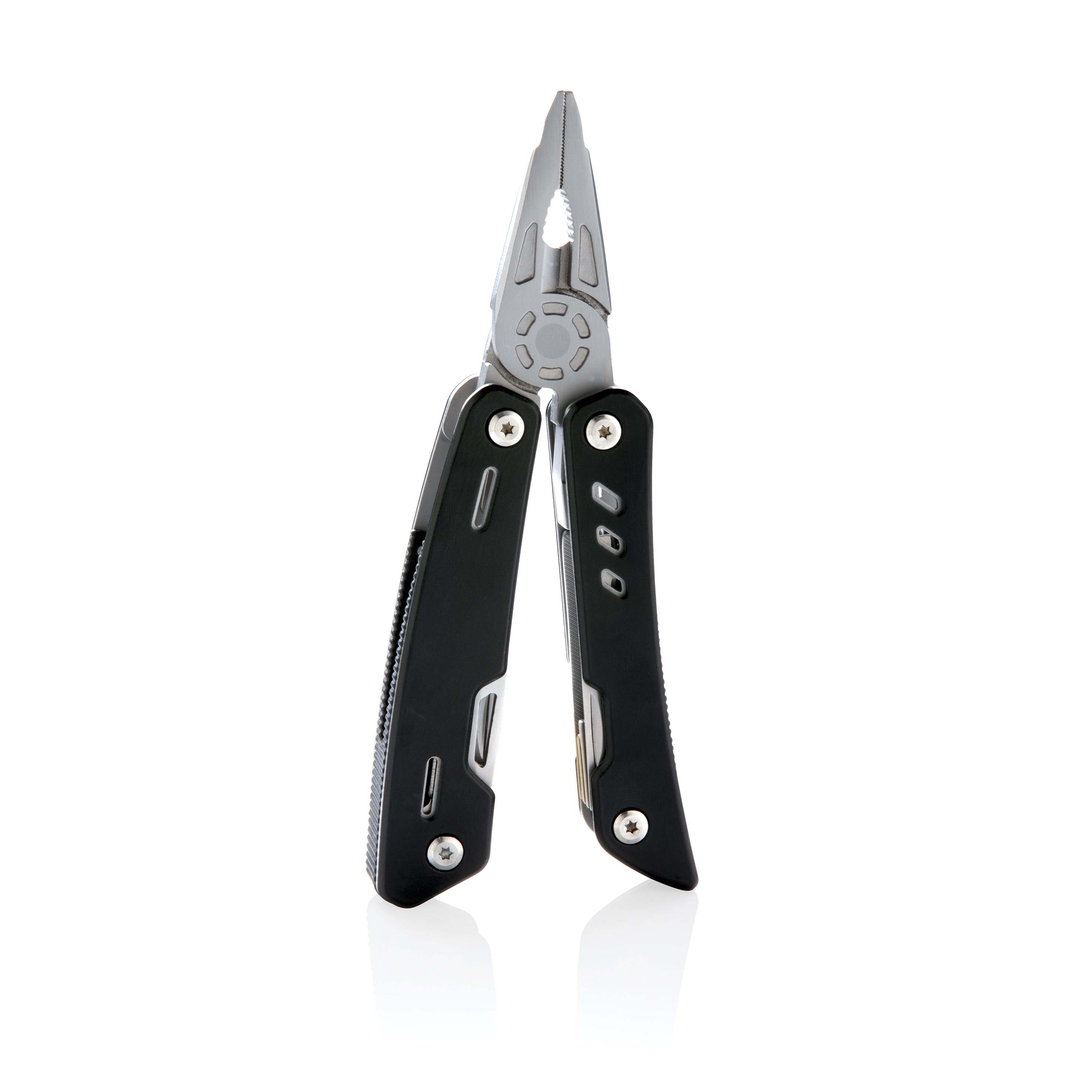 Multiherramienta sólida y duradera con 12 funciones, carcasa de aluminio y herramientas de acero inoxidable. Incluye: alicates de punta fina, alicates normales, cortaalambres, navaja, destornillador, destornillador plano pequeño, destornillador plano grande, sierra, abrelatas, abrebotellas, pelacables, punzón, lima. Presentado en caja de regalo.