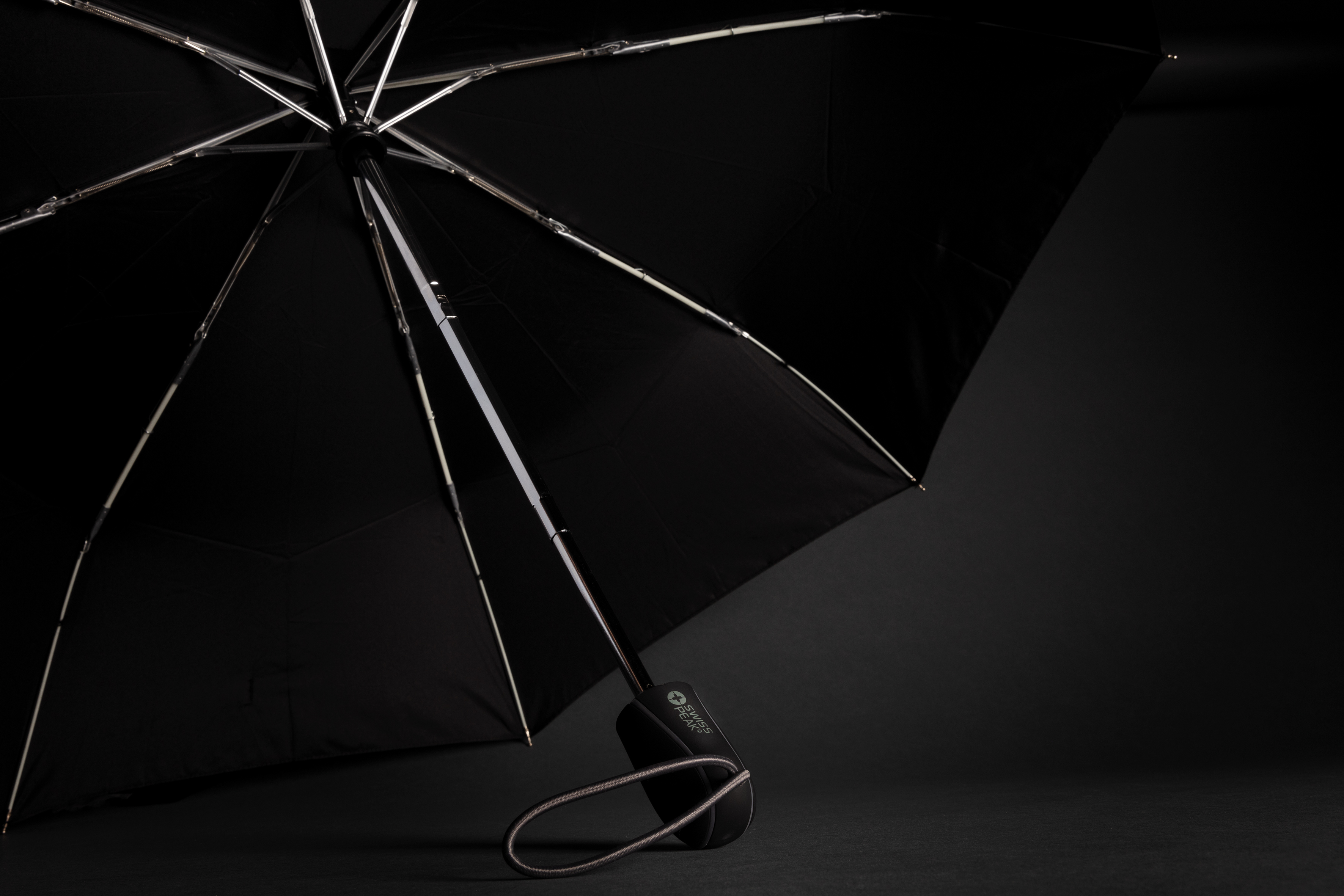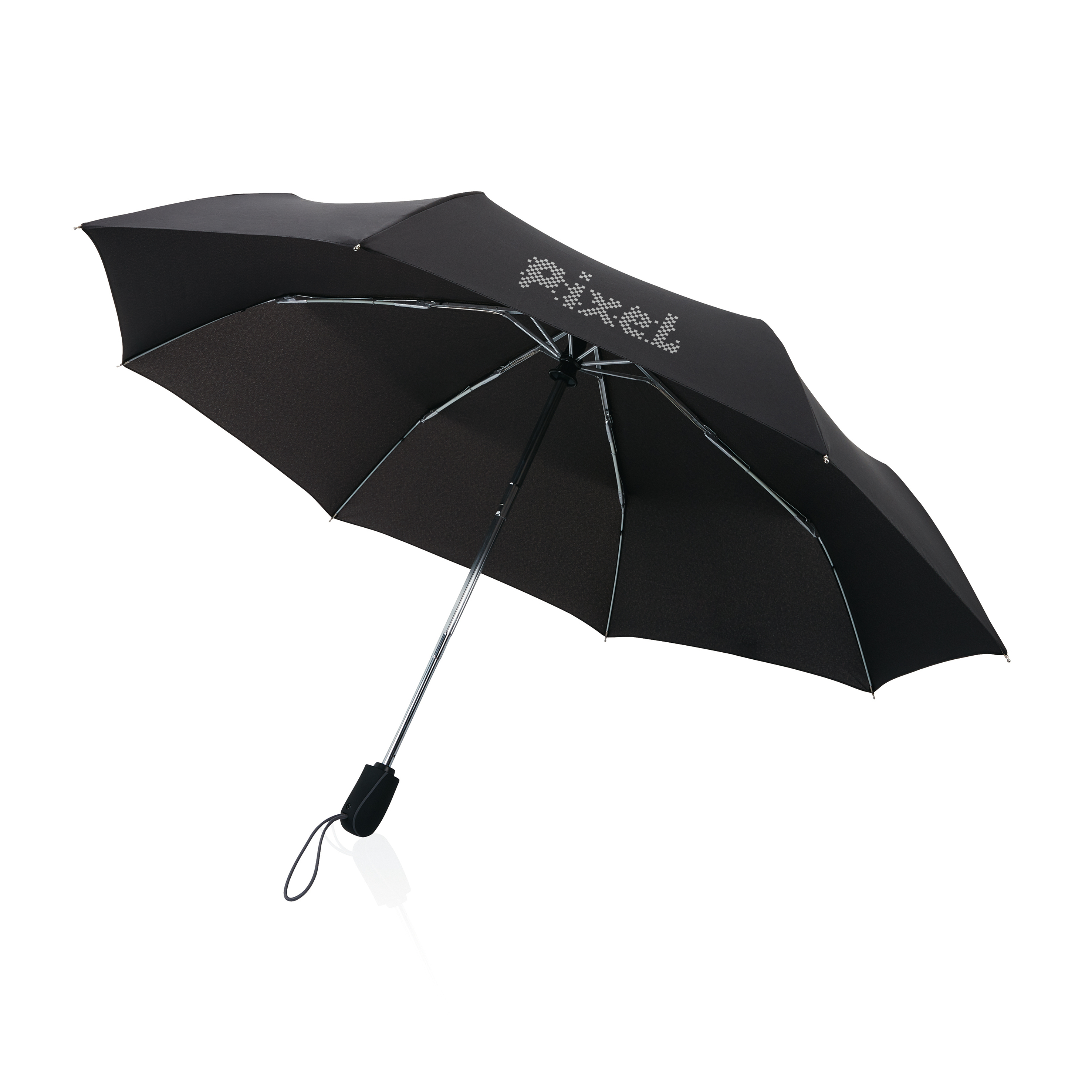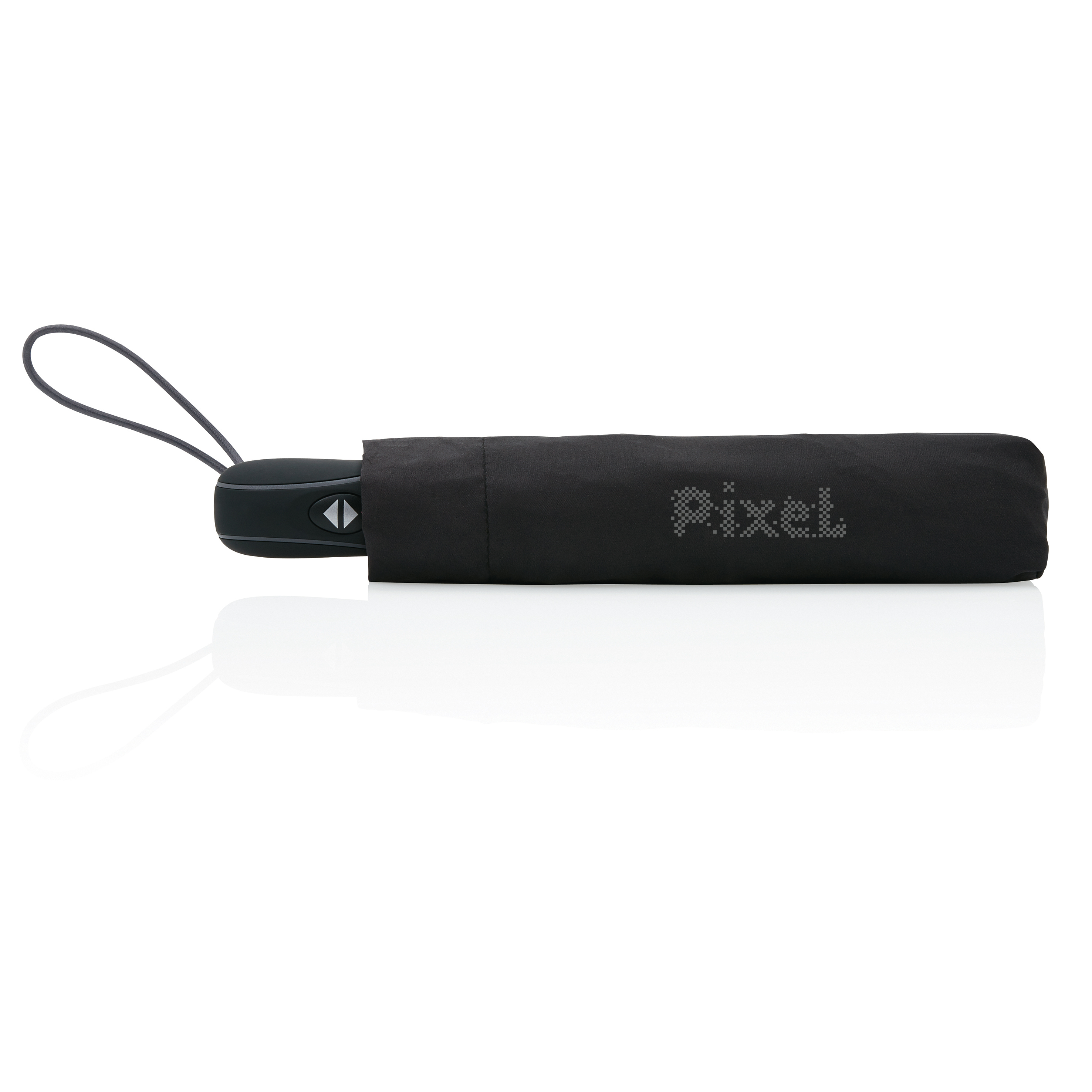 Este paraguas automático Swiss Peak presenta tres secciones y está fabricado en poliéster reciclado pongee 190T con trazador AWARE™, con eje de aluminio cromado y sistema cortavientos sostenido por varillas de fibra de vidrio. Apertura automática y cierre manual. Con marcador AWARE™ que valida el uso genuino de poliéster reciclado. El paraguas viene con una bolsa y se presenta en una caja de regalo Swiss Peak.