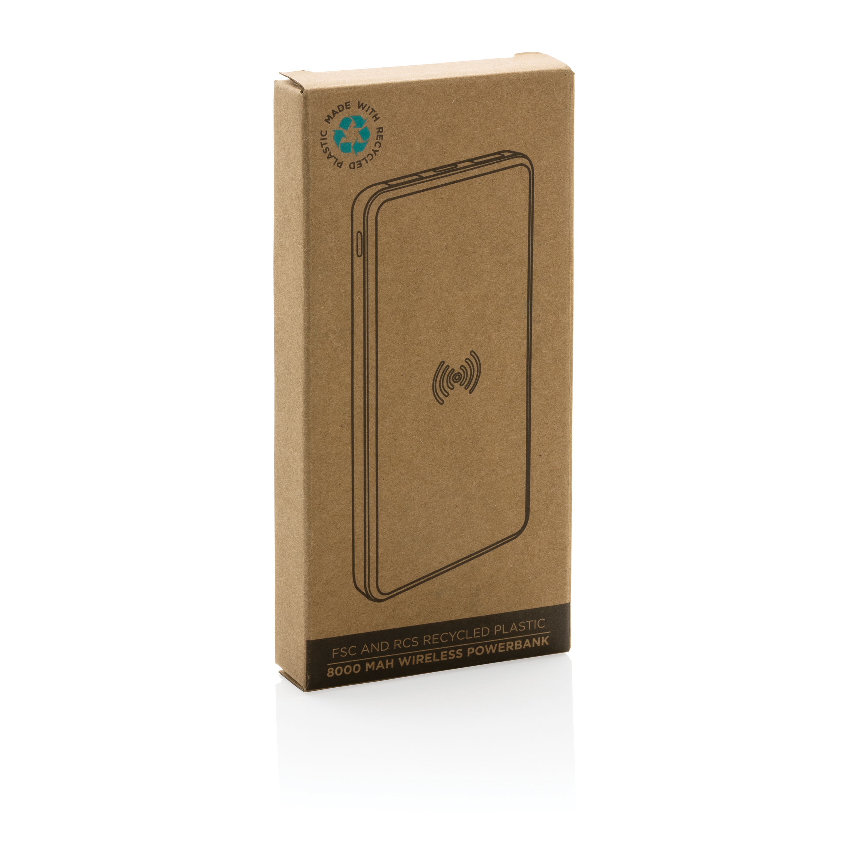 Powerbank de 8.000 mAh. Fabricado con plástico ABS reciclado certificado RCS (Recycled Claim Standard) con acabado suave al tacto y bambú certificado FSC®. Contenido reciclado total: 17% basado en el peso total del artículo. La certificación RCS garantiza una cadena de suministro completamente certificada de los materiales reciclados. Admite carga inalámbrica de 5W y carga a través de puerto USB por cable. Entrada tanto a través de micro USB como de tipo C. Cuando esté totalmente cargada te proporcionará la energía suficiente para recargar tu móvil hasta cuatro veces. El powerbank contiene una batería de polímero de litio de grado A de 8.000 mAh de larga duración. Los indicadores de energía indicarán el nivel de energía restante para que siempre sepas cuándo recargar. Entrada micro 5V/2A Entrada tipo C 5V/2A Salida USB 5V/2.4A. Salida Inalámbrica 5W 5V/1A. Presentado en envase mixto FSC®. Incluye cable de carga de TPE reciclado certificado por RCS.