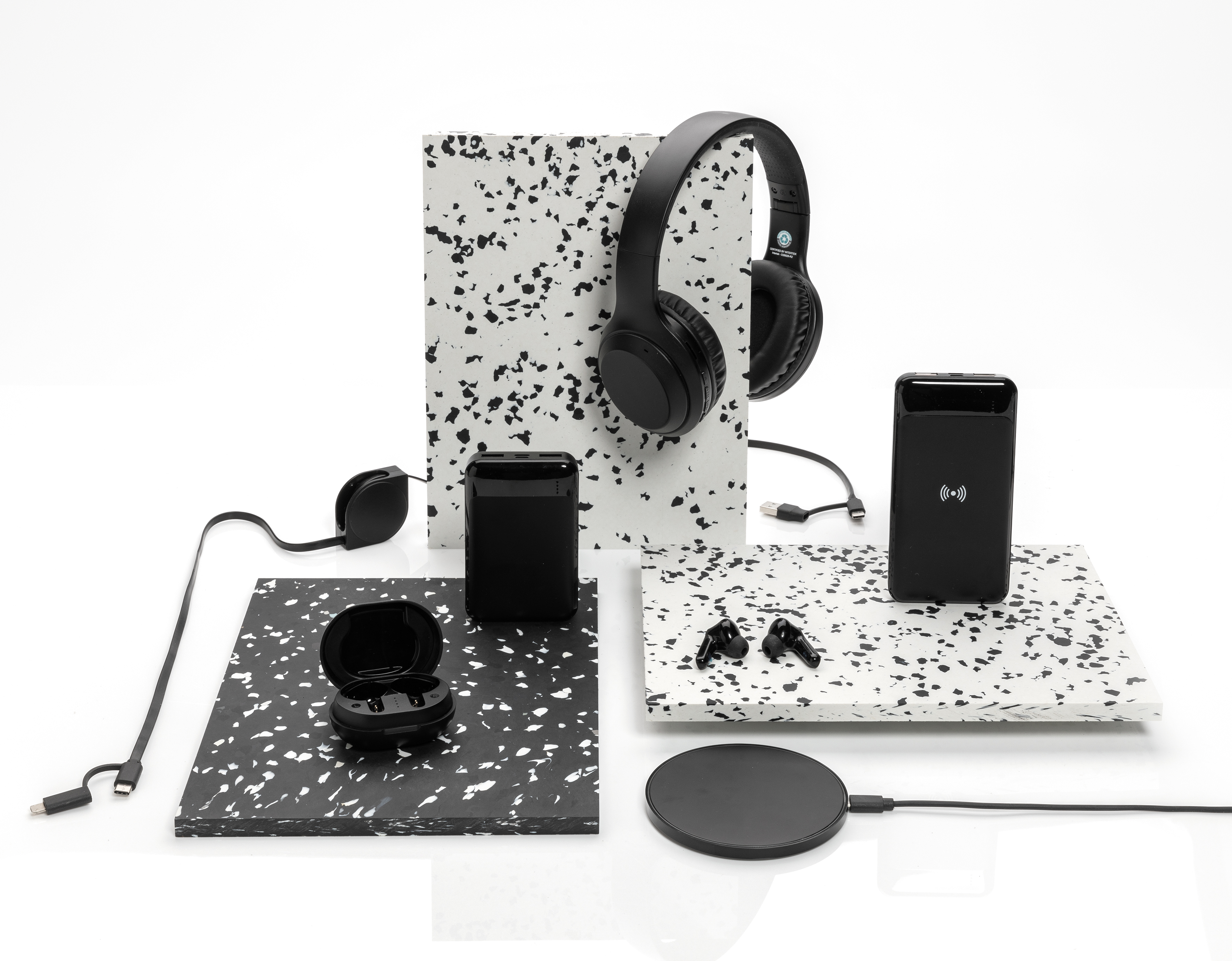 Powerbank de 8.000 mAh con cargador inalámbrico de 5W con carcasa de plástico ABS reciclado con certificación RCS. RCS (Recycled Claim Standard) es un estándar para verificar el contenido reciclado de un producto en toda la cadena de suministro. RCS es el estándar que se utiliza cuando una parte del artículo se ha fabricado con materiales reciclados. Total reciclado: 22% basado en el peso total del artículo. Cuando está completamente cargada, la batería te proporciona suficiente energía para recargar tu teléfono móvil hasta cuatro veces. El powerbank contiene una batería de polímero de litio de 8.000 mAh de grado A de larga duración. Los indicadores de energía indicarán el nivel de energía restante para que siempre sepas cuándo recargar. Entrada tipo C 5V/2A; Entrada Micro USB 5V/2A; Salida inalámbrica 5W; 2x salida USB 5V/2A; Artículo y accesorios sin PVC. Incluye cable de carga de material TPE reciclado sin PVC