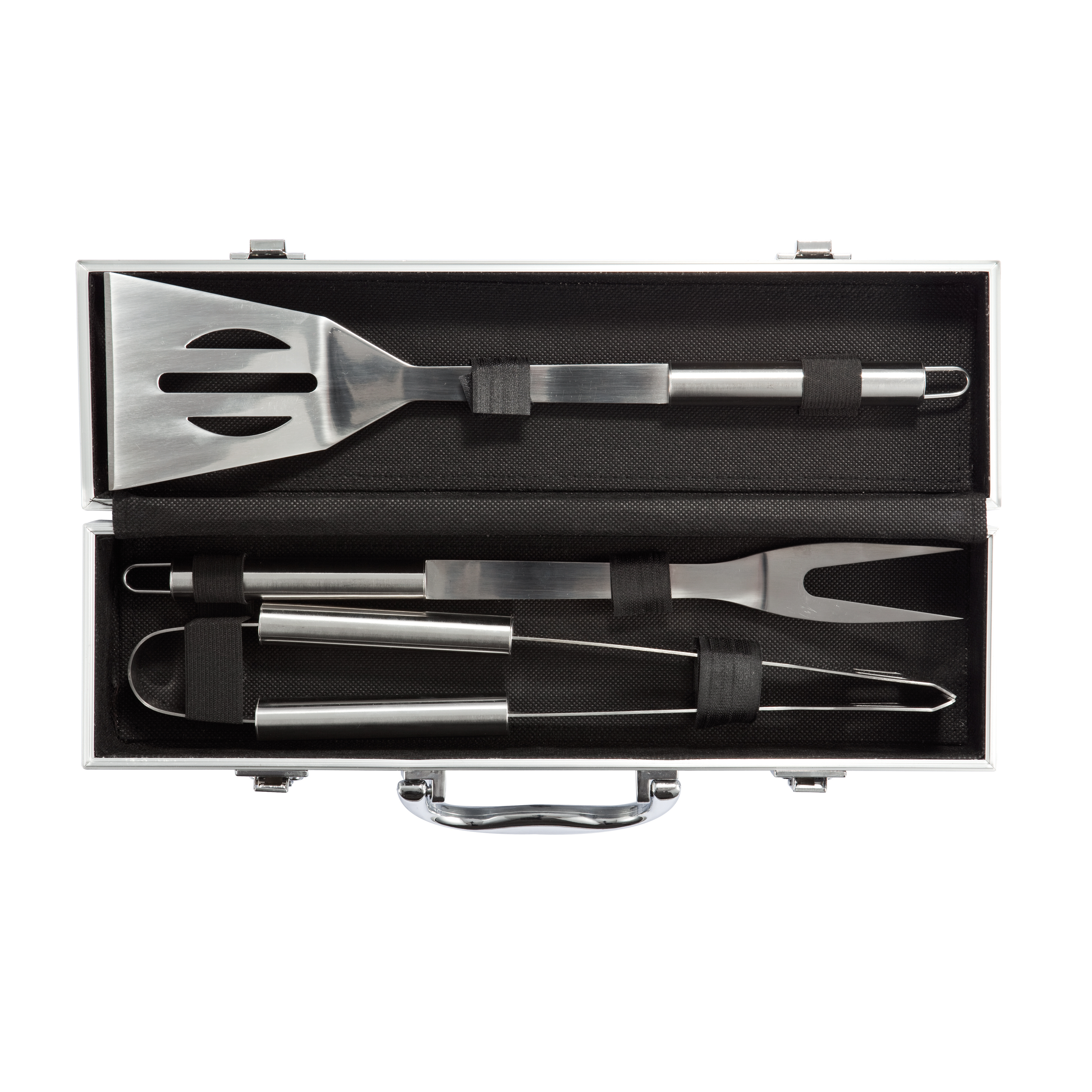 Set Barbacoa de 3 piezas de acero inoxidable que incluye espátula, tenedor con protector y tenazas. Presentado en caja de aluminio con bisagras y asa.