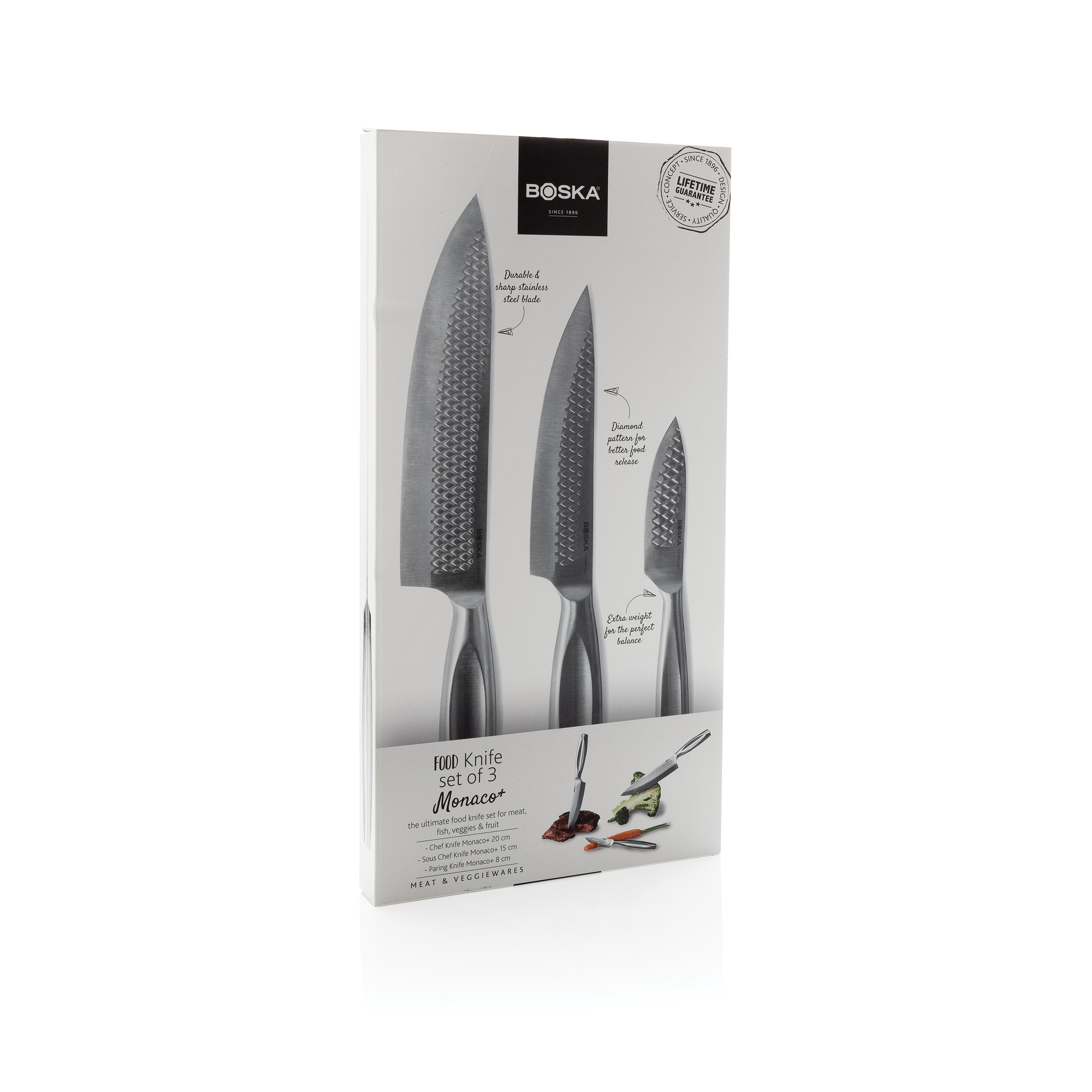 El set de cuchillos de cocina Monaco+ de BOSKA, una empresa certificada como B Corporation, es el set definitivo para todo amante de la cocina. Con las mismas características que los cuchillos profesionales: acero inoxidable de alta calidad, extra afilados y un mango delgado para un control total del cuchillo. El set incluye: Cuchillo de cocina (para cortar todo tipo de alimentos), Cuchillo para Chef (ideal para cortar, picar y rebanar) y Cuchillo de pelar (perfecto para cortar frutas y verduras). Este set debe lavarse a mano y está respaldado por una garantía de por vida.