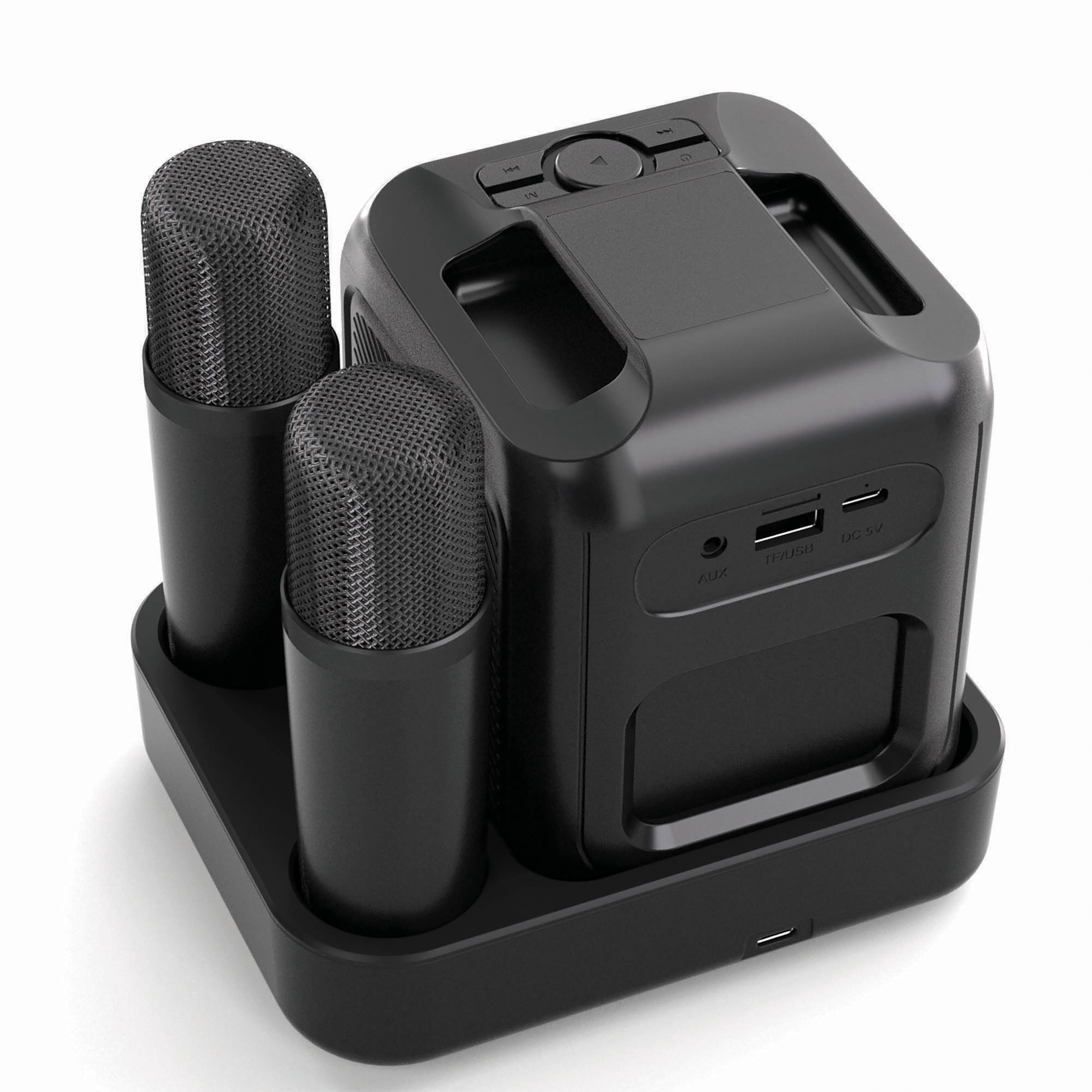 Canta, baila y diviértete con tus amigos con este set de karaoke de calidad con dos micrófonos que te permitirá cantar en estéreo con tus mejores amigos. El altavoz y el micrófono vienen con una base de carga por inducción para que puedas cargar los tres fácilmente al mismo tiempo. Simplemente enciende un video musical con letra o habilita la letra en tu reproductor de música favorito y prepárate para horas de diversión! El altavoz de 5W viene con una batería de 2000 mah que permite hasta 6 horas de uso. El altavoz también admite tarjeta TF y USB para música. Al utilizar los micrófonos puedes alejarte hasta 10 metros del altavoz. Fabricado con ABS reciclado certificado RCS (Recycled Claim Standard). Contenido reciclado total: 53% basado en el peso total del artículo. La certificación RCS garantiza una cadena de suministro de materiales reciclados completamente certificada. Incluye cable de carga tipo C. Fabricado con TPE reciclado certificado RCS. Presentado en mezcla FSC®. Sin PVC.