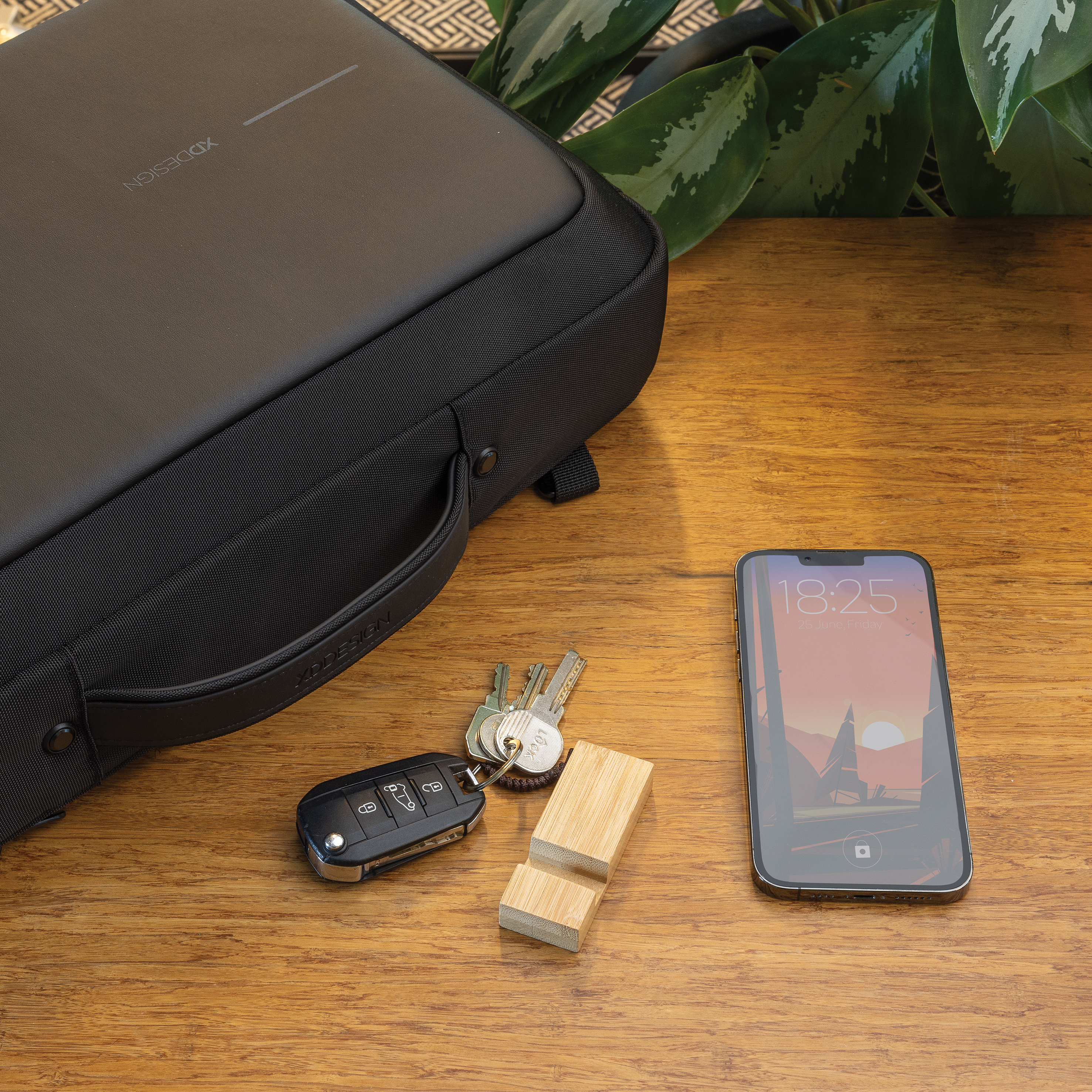 Llavero con soporte para teléfono de bambú certificado FSC® 100. Con cuerda de tela y llavero de metal. Práctico para que siempre tengas un soporte para teléfono contigo cuando hagas una llamada o quieras ver una película. Presentado en sobre sin plástico.