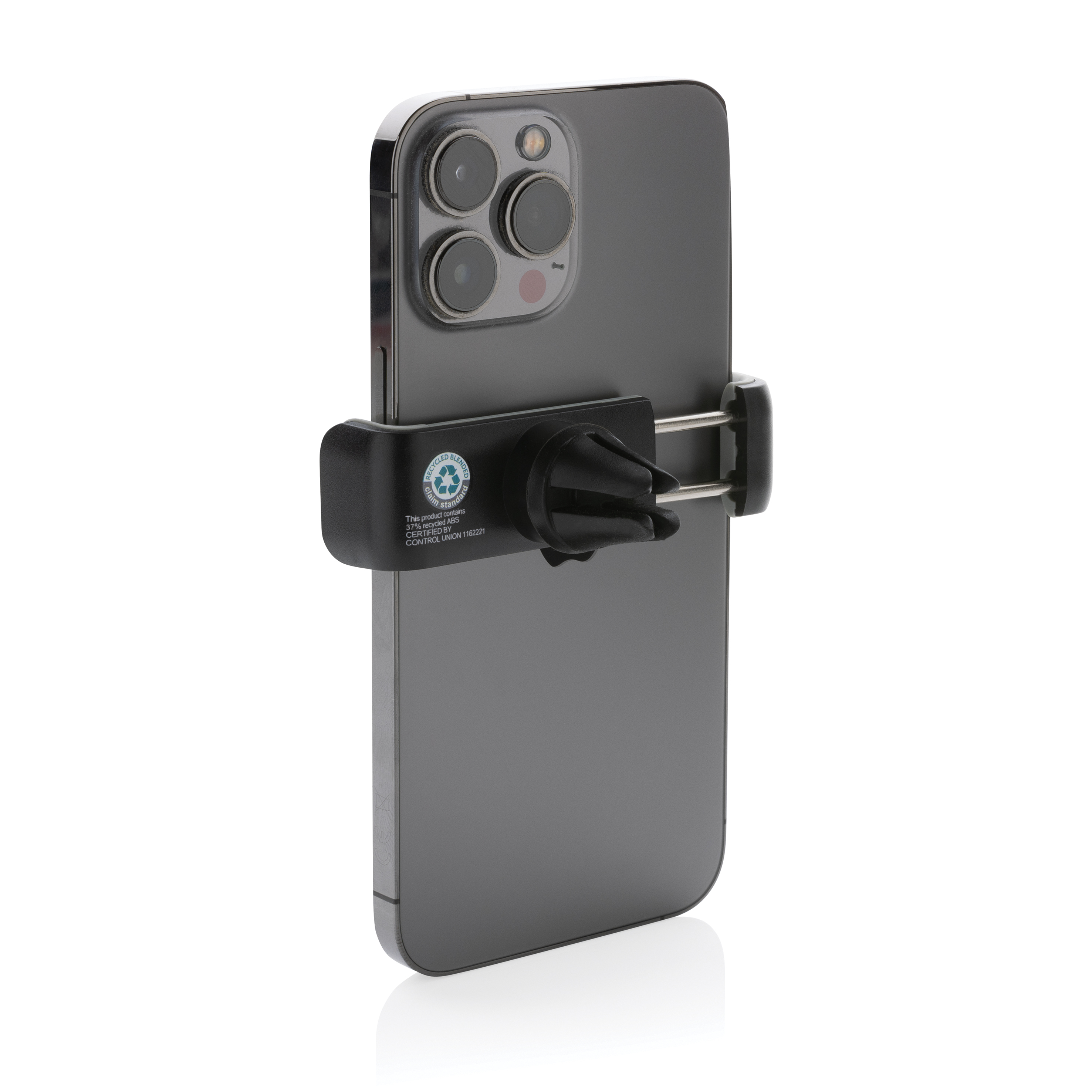 Soporte para coche universal y giratorio de 360 grados fabricado con ABS reciclado certificado RCS (Recycled Claim Standard). Contenido reciclado total: 37% basado en el peso total del artículo. La certificación RCS garantiza una cadena de suministro completamente certificada de los materiales reciclados. Simplemente haz clic en el artículo en su rejilla de ventilación y coloca tu teléfono móvil (hasta 6.2″) en el soporte. Hecho de ABS reciclado resistente al calor y silicona fuerte para que el artículo sea duradero y evitar que se caiga de la rejilla de ventilación mientras conduces. Con mecanismo de acero inoxidable en el interior para garantizar que tu teléfono permanezca en su lugar