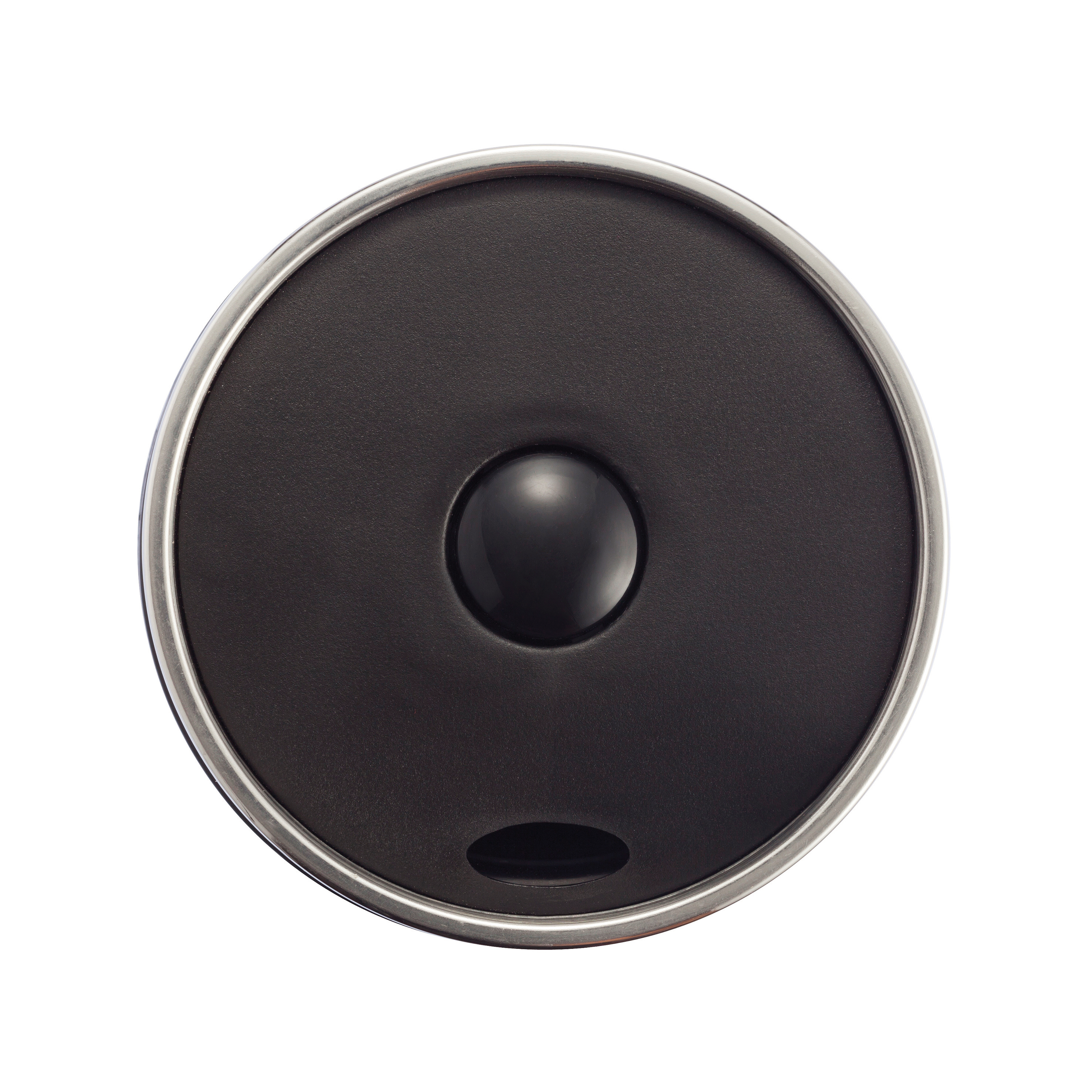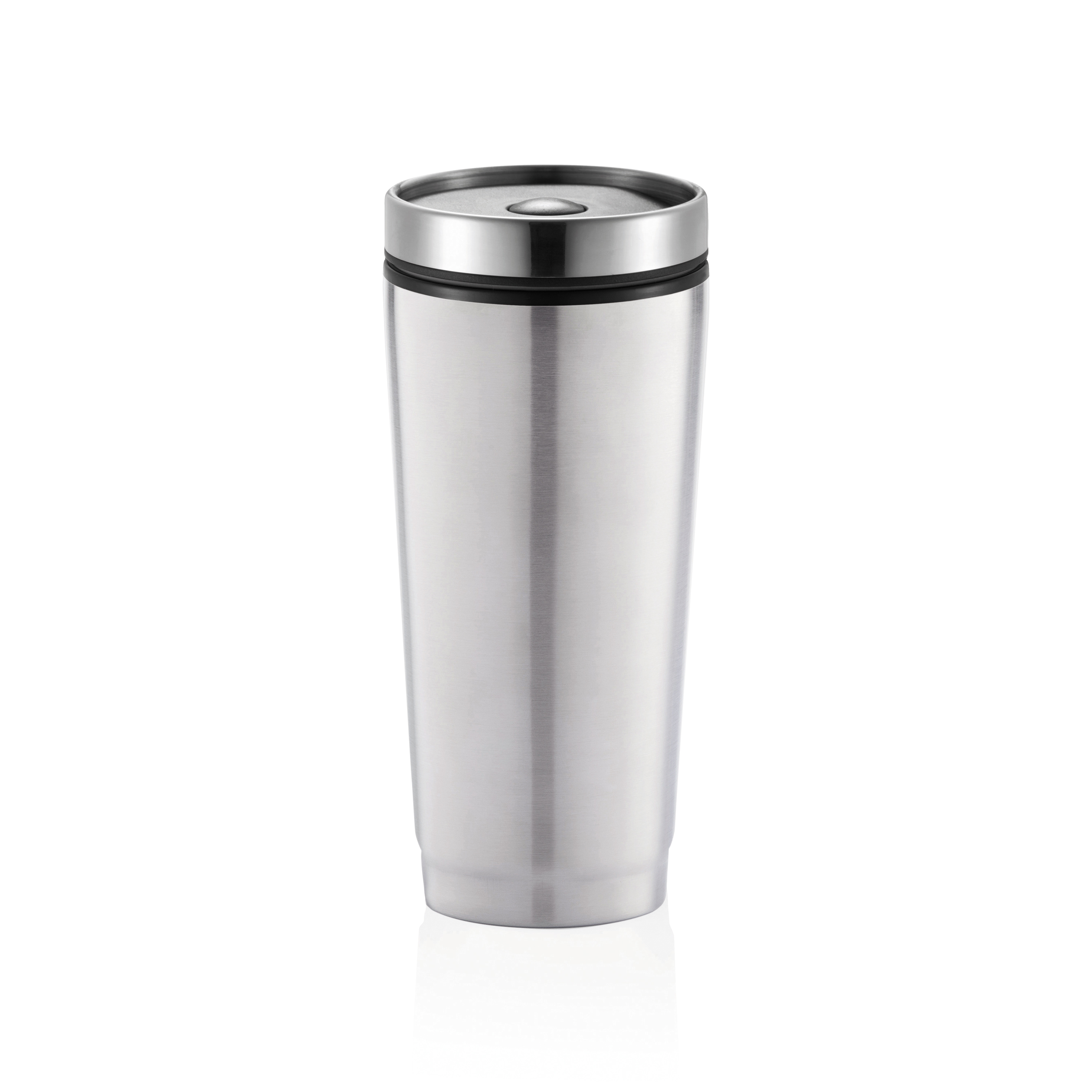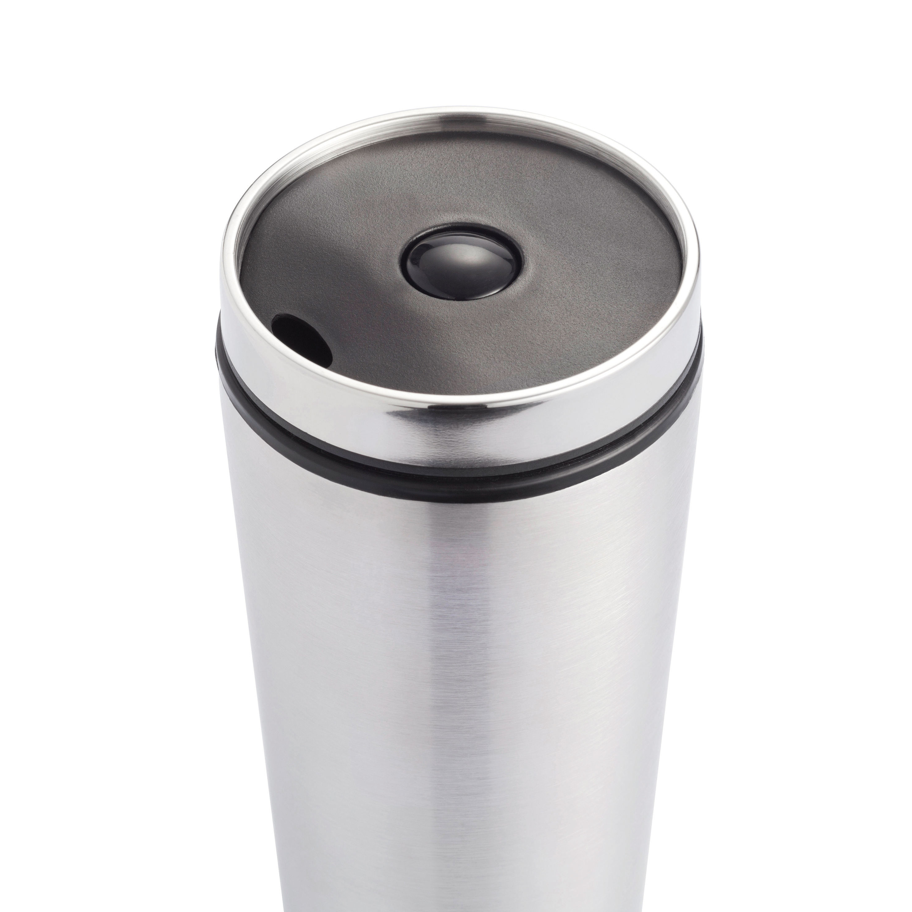 Vaso de 350ml, acero inoxidable exterior, interior PP, tapa de rosca y cierre presionando botón para evitar goteo, para usar con una sola mano. Diseño registrado®