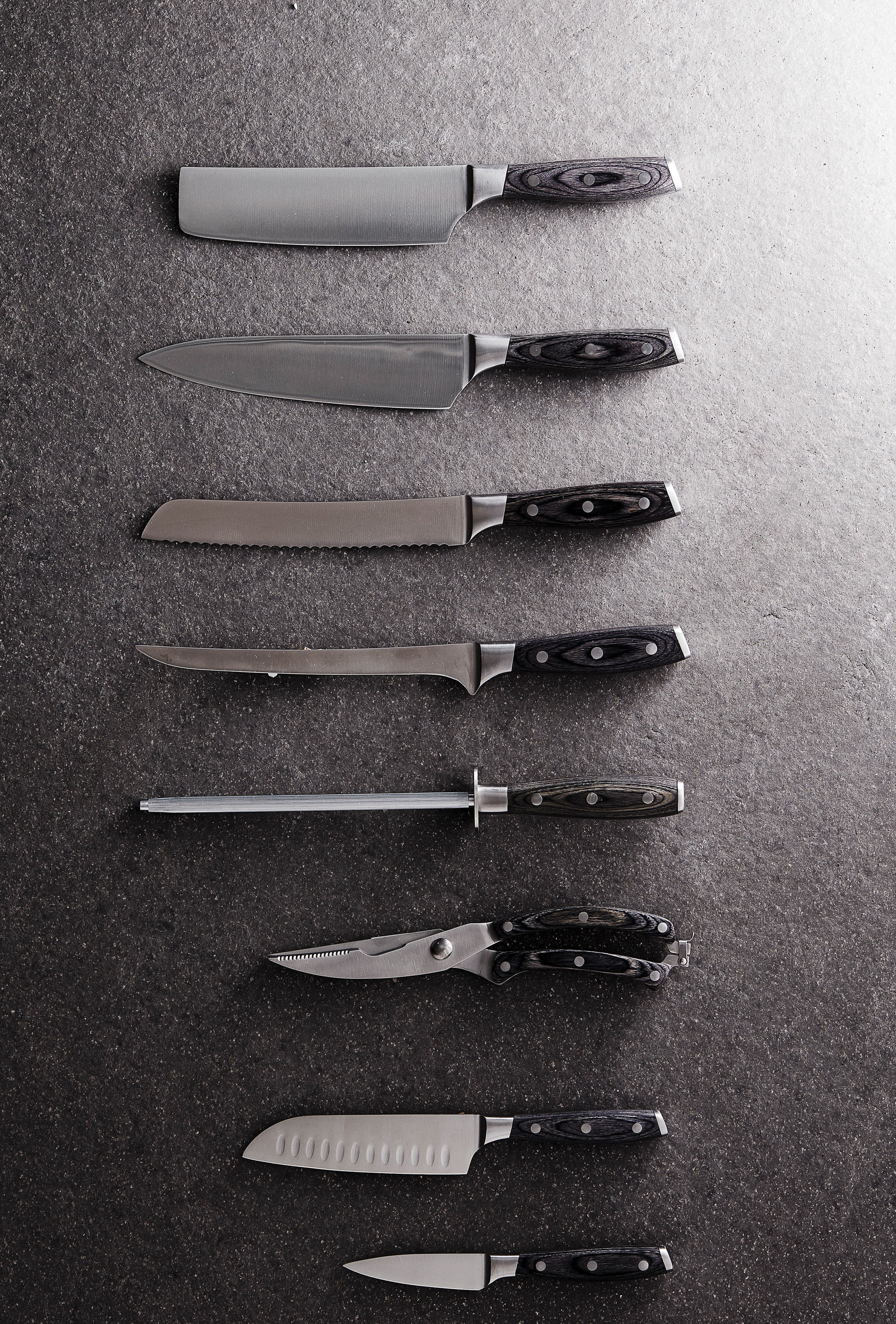 Cuchillo Santoku fabricado en acero alemán X50CrMoV15 con mango de Pakkawood. El mango de fácil agarre y el excelente equilibrio de la hoja hacen que el cuchillo sea cómodo y fácil de manejar. Tamaño: hoja de 14 cm.