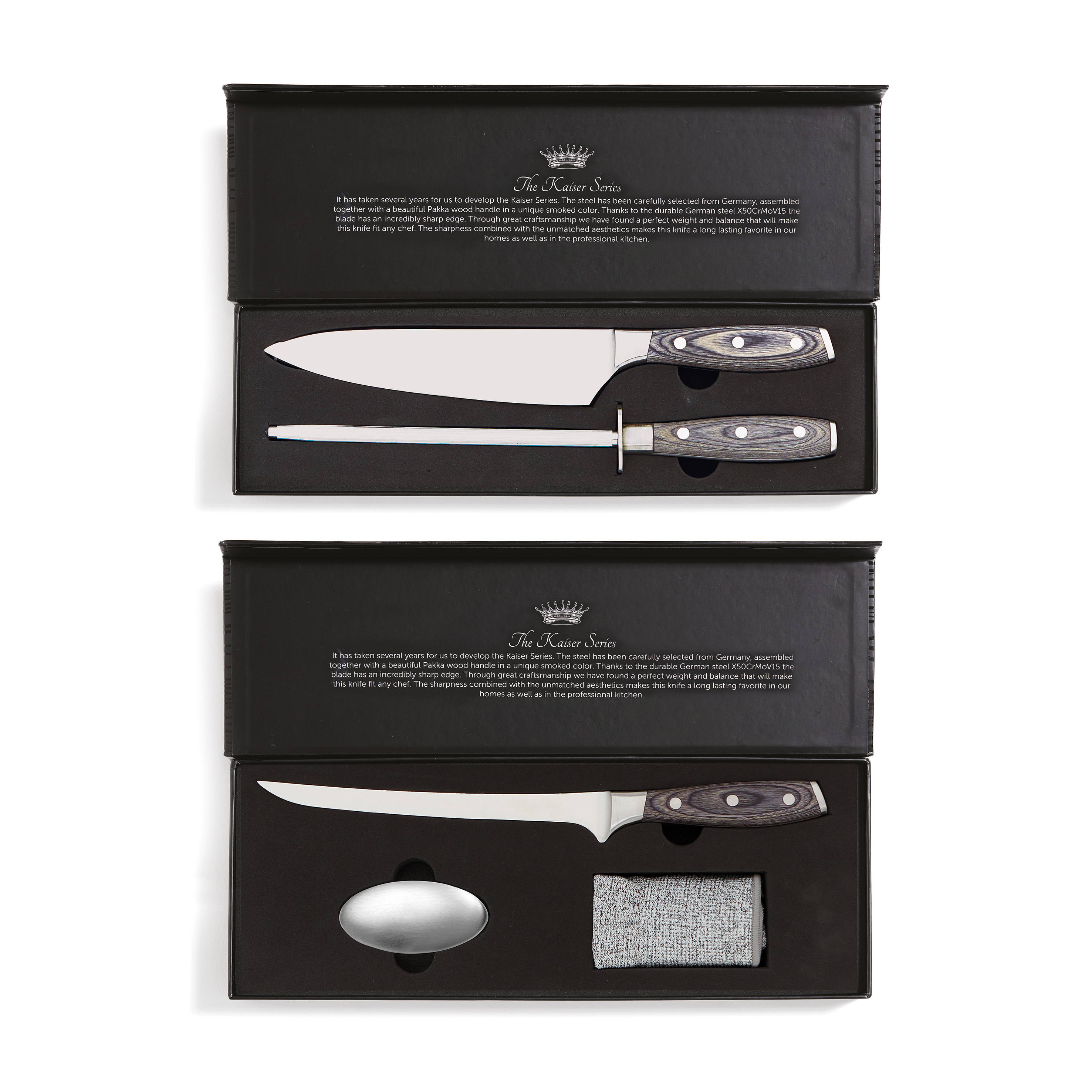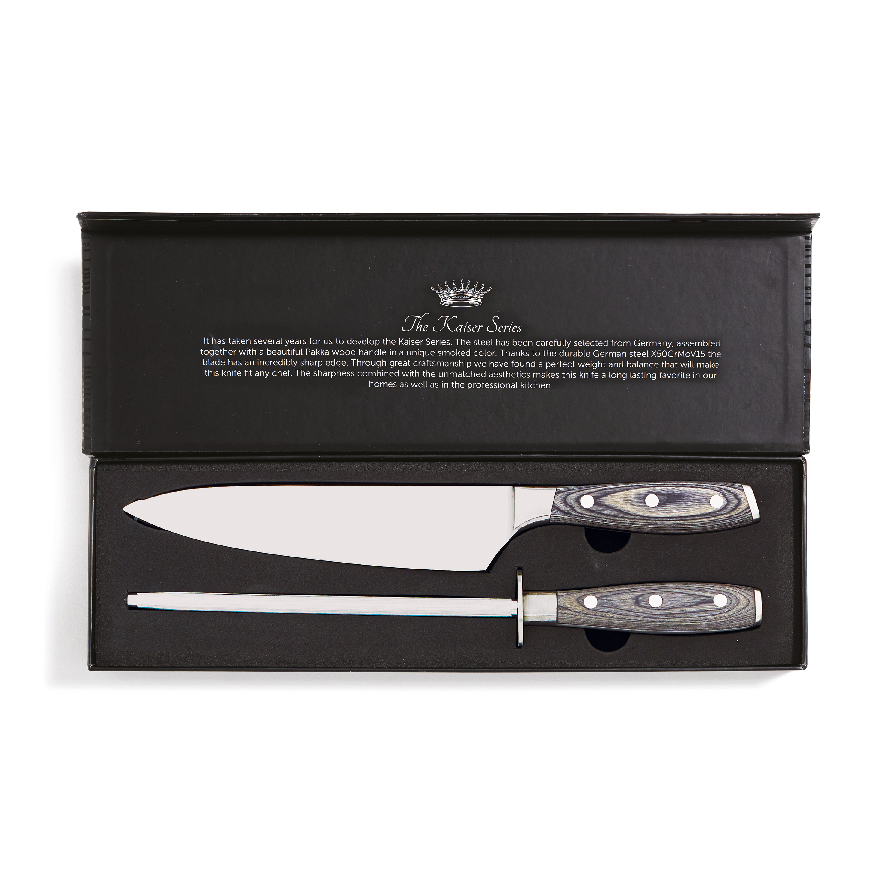 Juego de un cuchillo de chef y un cuchillo para verdura. Los cuchillos están hechos de acero alemán X50CrMoV15 con mango de Pakkawood. El mango de fácil agarre y el excelente equilibrio de la hoja hacen que el cuchillo sea cómodo y fácil de manejar. Cuchillo cebollero: hoja de 20 cm. Cuchillo para verdura: hoja de 8 cm.